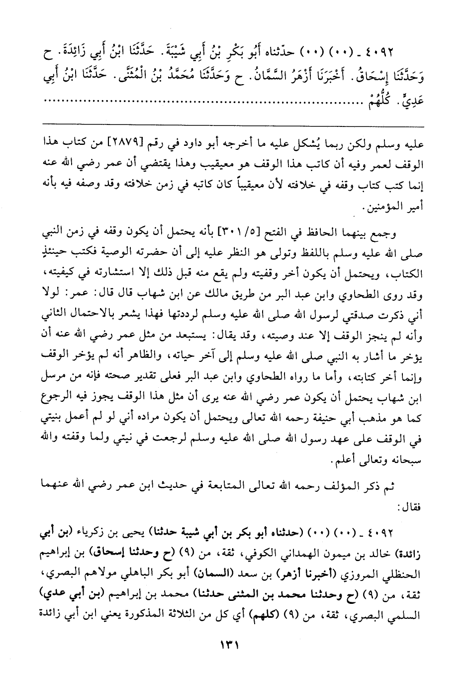 وجمع بينهما الحافظ في الفتح [٥/ ٣٠١] بأنه يحتمل أن يكون وقفه في زمن النبي صلى الله عليه وسلم باللفظ وتولى هو النظر عليه إلى أن حضرته الوصية فكتب حينئذٍ الكتاب، ويحتمل أن يكون أخر وقفيته ولم يقع منه قبل ذلك إلا استشارته في كيفيته، وقد روى الطحاوي وابن عبد البر من طريق مالك عن ابن شهاب قال قال: عمر: لولا أني ذكرت صدقتي لرسول الله صلى الله عليه وسلم لرددتها فهذا يشعر بالاحتمال الثاني وأنه لم ينجز الوقف إلا عند وصيته، وقد يقال: يستبعد من مثل عمر رضي الله عنه أن يؤخر ما أشار به النبي صلى الله عليه وسلم إلى آخر حياته، والظاهر أنه لم يؤخر الوقف وإنما أخر كتابته، وأما ما رواه الطحاوي وابن عبد البر فعلى تقدير صحته فإنه من مرسل ابن شهاب يحتمل أن يكون عمر رضي الله عنه يرى أن مثل هذا الوقف يجوز فيه الرجوع كما هو مذهب أبي حنيفة رحمه الله تعالى ويحتمل أن يكون مراده أني لو لم أعمل بنيتي في الوقف على عهد رسول الله صلى الله عليه وسلم لرجعت في نيتي ولما وقفته والله سبحانه وتعالى أعلم.