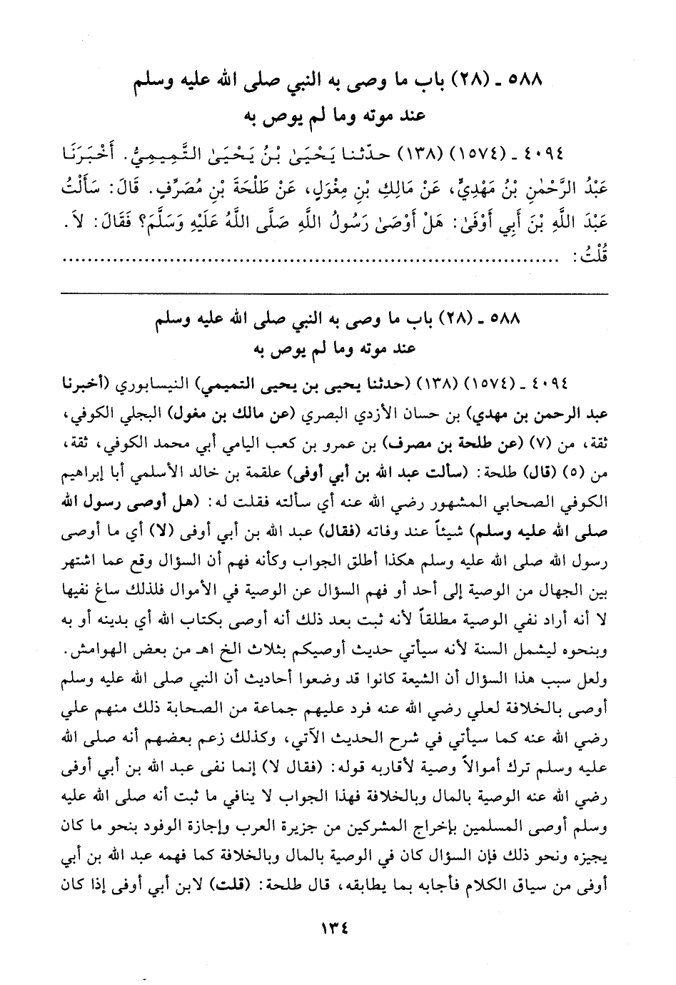٤٠٩٤ - (١٥٧٤) (١٣٨) حدَّثنا يَحْيَى بْنُ يَحْيَى التَّمِيمِيُّ. أَخْبَرَنَا عَبْدُ الرَّحْمنِ بْنُ مَهْدِيٍّ، عَنْ مَالِكِ بْنِ مِغْوَلٍ، عَنْ طَلْحَةَ بْنِ مُصَرِّفٍ. قَال: سَأَلْتُ عَبْدَ اللهِ بْنَ أَبِي أَوْفَى: هَلْ أَوْصَى رَسُولُ اللهِ صَلَّى اللهُ عَلَيهِ وَسَلَّمَ؟ فَقَال: لَا. قُلْتُ: