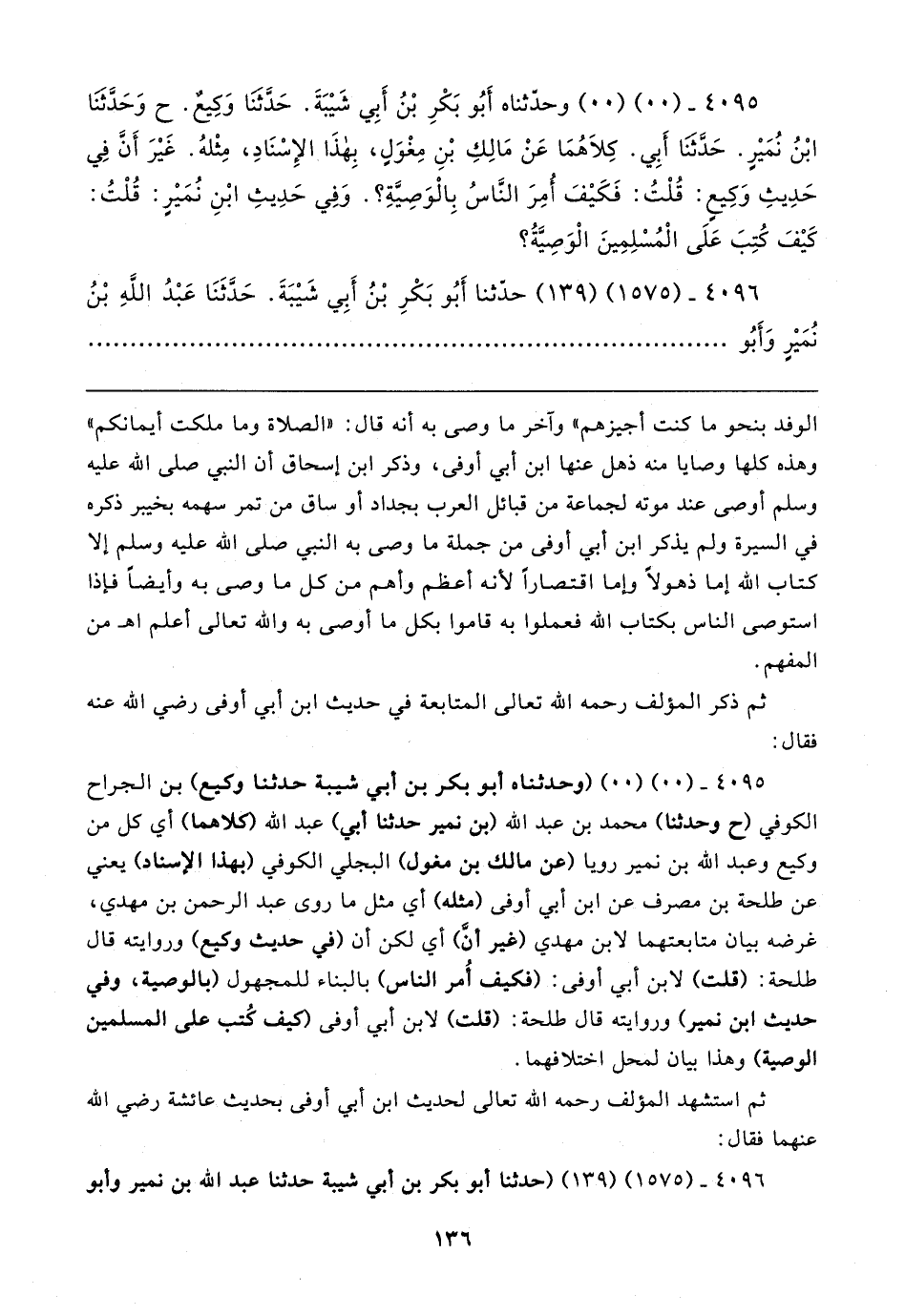 ٤٠٩٥ - (٠٠) (٠٠) (وحدثناه أبو بكر بن أبي شيبة حدثنا وكيع) بن الجراح الكوفي (ح وحدثنا) محمد بن عبد الله (بن نمير حدثنا أبي) عبد الله (كلاهما) أي كل من وكيع وعبد الله بن نمير رويا (عن مالك بن مغول) البجلي الكوفي (بهذا الإسناد) يعني عن طلحة بن مصرف عن ابن أبي أوفى (مثله) أي مثل ما روى عبد الرحمن بن مهدي، غرضه بيان متابعتهما لابن مهدي (غير أن) أي لكن أن (في حديث وكيع) وروايته قال طلحة: (قلت) لابن أبي أوفى: (فكيف أُمر الناس) بالبناء للمجهول (بالوصية، وفي حديث ابن نمير) وروايته قال طلحة: (قلت) لابن أبي أوفى (كيف كُتب على المسلمين الوصية) وهذا بيان لمحل اختلافهما.