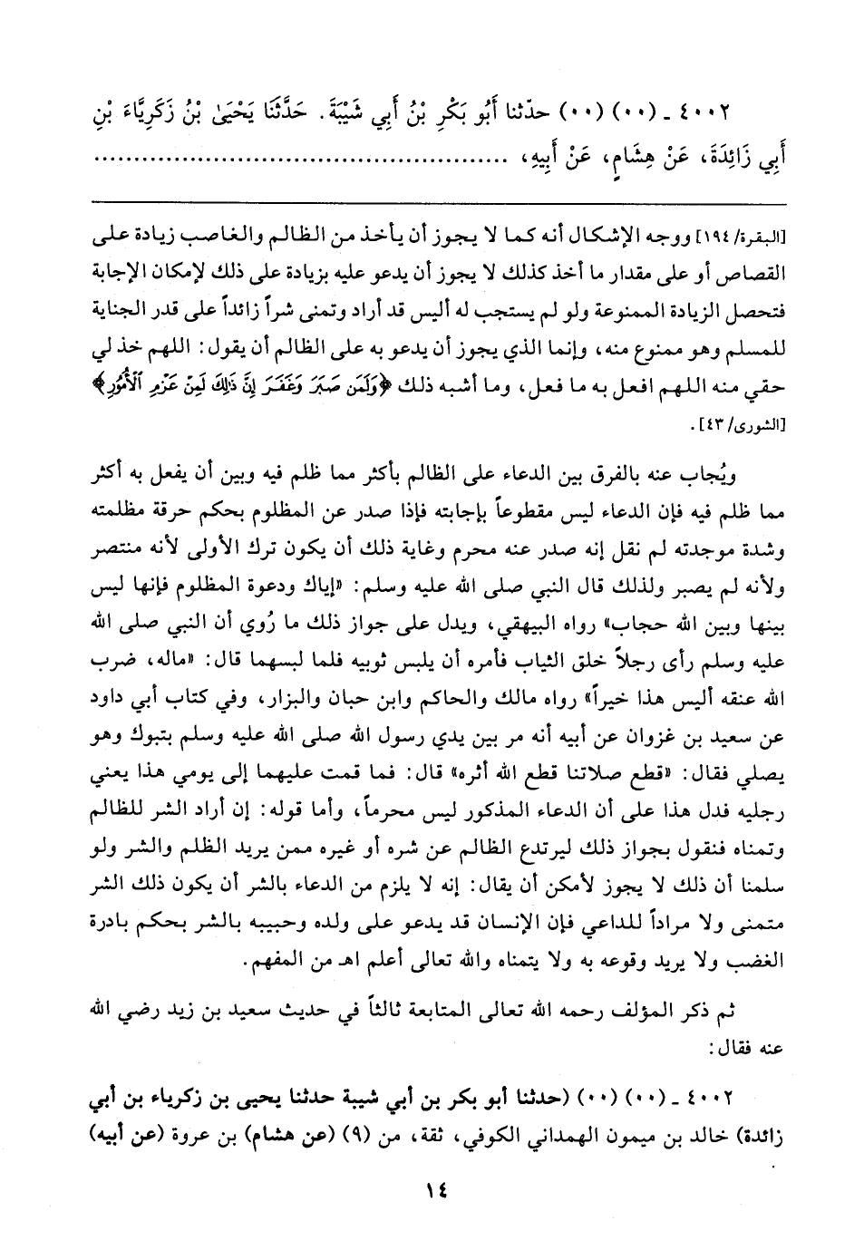 ٤٠٠٢ - (٠٠) (٠٠) (حدثنا أبو بكر بن أبي شيبة حدثنا يحيى بن زكرياء بن أبي زائدة) خالد بن ميمون الهمداني الكوفي، ثقة، من (٩) (عن هشام) بن عروة (عن أبيه)