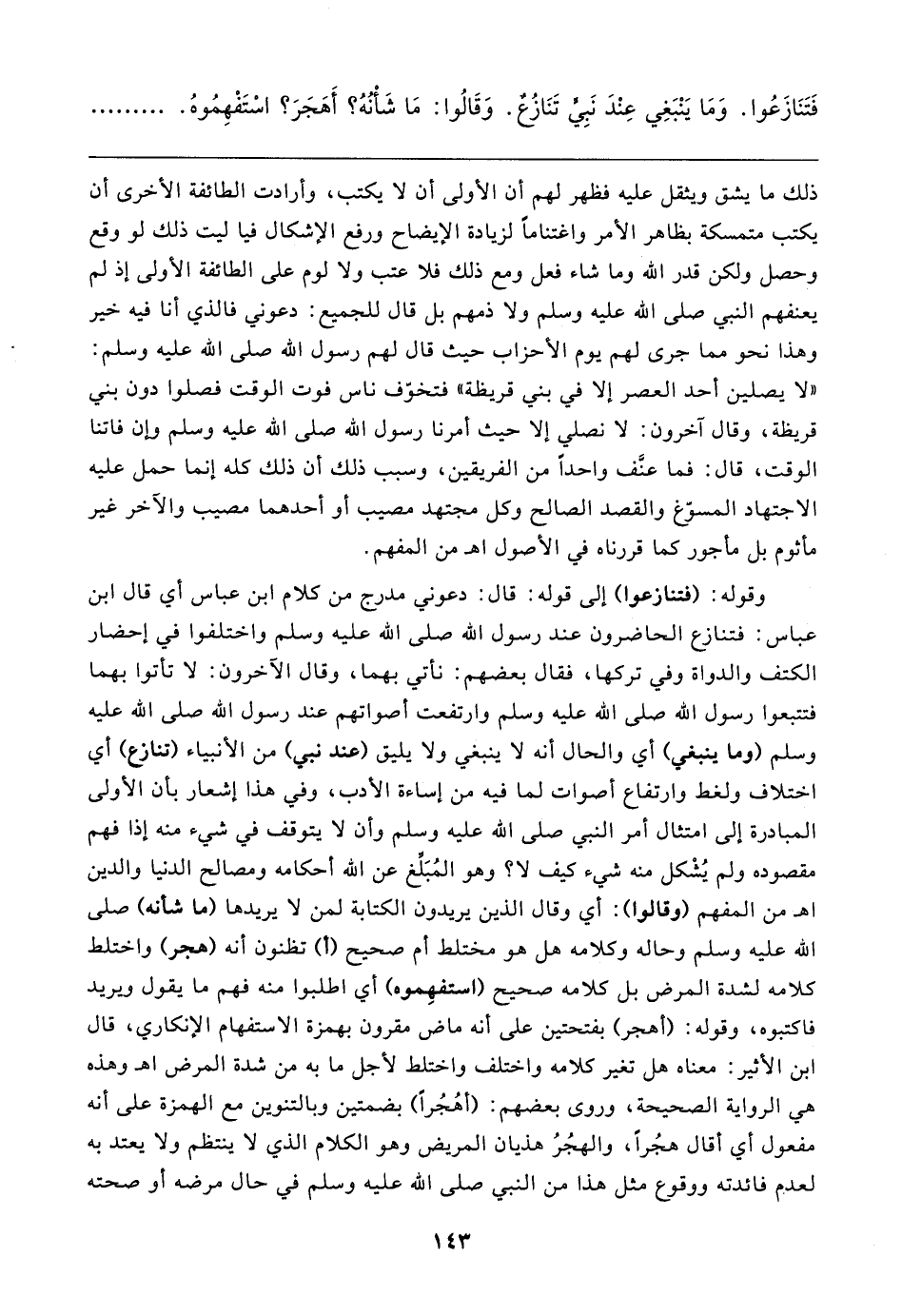وقوله: (فتنازعوا) إلى قوله: قال: دعوني مدرج من كلام ابن عباس أي قال ابن عباس: فتنازع الحاضرون عند رسول الله صلى الله عليه وسلم واختلفوا في إحضار الكتف والدواة وفي تركها، فقال بعضهم: نأتي بهما، وقال الآخرون: لا تأتوا بهما فتتبعوا رسول الله صلى الله عليه وسلم وارتفعت أصواتهم عند رسول الله صلى الله عليه وسلم (وما ينبغي) أي والحال أنه لا ينبغي ولا يليق (عند نبي) من الأنبياء (تنازع) أي اختلاف ولغط وارتفاع أصوات لما فيه من إساءة الأدب، وفي هذا إشعار بأن الأولى المبادرة إلى امتثال أمر النبي صلى الله عليه وسلم وأن لا يتوقف في شيء منه إذا فهم مقصوده ولم يُشْكل منه شيء كيف لا؟ وهو المُبَلِّغ عن الله أحكامه ومصالح الدنيا والدين اهـ من المفهم (وقالوا): أي وقال الذين يريدون الكتابة لمن لا يريدها (ما شأنه) صلى الله عليه وسلم وحاله وكلامه هل هو مختلط أم صحيح (أ) تظنون أنه (هجر) واختلط كلامه لشدة المرض بل كلامه صحيح (استفهِموه) أي اطلبوا منه فهم ما يقول ويريد فاكتبوه، وقوله: (أهجر) بفتحتين على أنه ماض مقرون بهمزة الاستفهام الإنكاري، قال ابن الأثير: معناه هل تغير كلامه واختلف واختلط لأجل ما به من شدة المرض اهـ وهذه هي الرواية الصحيحة، وروى بعضهم: (أهُجُرًا) بضمتين وبالتنوين مع الهمزة على أنه مفعول أي أقال هجُرًا، والهجُرُ هذيان المريض وهو الكلام الذي لا ينتظم ولا يعتد به لعدم فائدته ووقوع مثل هذا من النبي صلى الله عليه وسلم في حال مرضه أو صحته