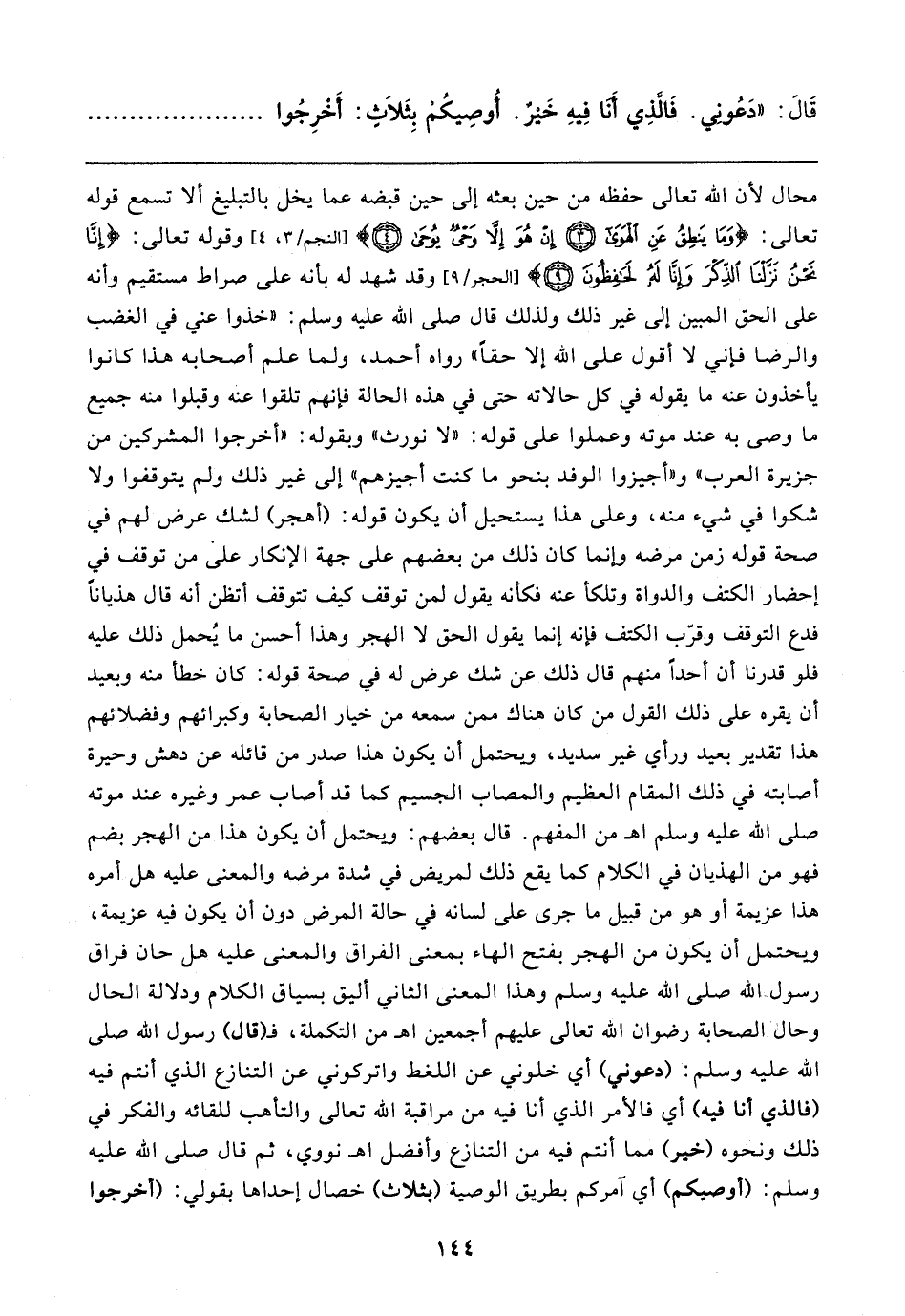 محال لأن الله تعالى حفظه من حين بعثه إلى حين قبضه عما يخل بالتبليغ ألا تسمع قوله تعالى: {وَمَا يَنْطِقُ عَنِ الْهَوَى (٣) إِنْ هُوَ إلا وَحْيٌ يُوحَى} [النجم / ٣، ٤] وقوله تعالى: {إِنَّا نَحْنُ نَزَّلْنَا الذِّكْرَ وَإِنَّا لَهُ لَحَافِظُونَ (٩)} [الحجر: ٩] وقد شهد له بأنه على صراط مستقيم وأنه على الحق المبين إلى غير ذلك ولذلك قال صلى الله عليه وسلم: "خذوا عني في الغضب والرضا فإني لا أقول على الله إلا حقًّا" رواه أحمد، ولما علم أصحابه هذا كانوا يأخذون عنه ما يقوله في كل حالاته حتى في هذه الحالة فإنهم تلقوا عنه وقبلوا منه جميع ما وصى به عند موته وعملوا على قوله: "لا نورث" وبقوله: "أخرجوا المشركين من جزيرة العرب" و"أجيزوا الوفد بنحو ما كنت أجيزهم" إلى غير ذلك ولم يتوقفوا ولا شكوا في شيء منه، وعلى هذا يستحيل أن يكون قوله: (أهجر) لشك عرض لهم في صحة قوله زمن مرضه وإنما كان ذلك من بعضهم على جهة الإنكار على من توقف في إحضار الكتف والدواة وتلكأ عنه فكأنه يقول لمن توقف كيف تتوقف أتظن أنه قال هذيانًا فدع التوقف وقرّب الكتف فإنه إنما يقول الحق لا الهجر وهذا أحسن ما يُحمل ذلك عليه فلو قدرنا أن أحدًا منهم قال ذلك عن شك عرض له في صحة قوله: كان خطأ منه وبعيد أن يقره على ذلك القول من كان هناك ممن سمعه من خيار الصحابة وكبرائهم وفضلائهم هذا تقدير بعيد ورأي غير سديد، ويحتمل أن يكون هذا صدر من قائله عن دهش وحيرة أصابته في ذلك المقام العظيم والمصاب الجسيم كما قد أصاب عمر وغيره عند موته صلى الله عليه وسلم اهـ من المفهم. قال بعضهم: ويحتمل أن يكون هذا من الهجر بضم فهو من الهذيان في الكلام كما يقع ذلك لمريض في شدة مرضه والمعنى عليه هل أمره هذا عزيمة أو هو من قبيل ما جرى على لسانه في حالة المرض دون أن يكون فيه عزيمة، ويحتمل أن يكون من الهجر بفتح الهاء بمعنى الفراق والمعنى عليه هل حان فراق رسول الله صلى الله عليه وسلم وهذا المعنى الثاني أليق بسياق الكلام ودلالة الحال وحال الصحابة رضوان الله تعالى عليهم أجمعين اهـ من التكملة، فـ (قال) رسول الله صلى الله عليه وسلم: (دعوني) أي خلوني عن اللغط واتركوني عن التنازع الذي أنتم فيه (فالذي أنا فيه) أي فالأمر الذي أنا فيه من مراقبة الله تعالى والتأهب للقائه والفكر في ذلك ونحوه (خير) مما أنتم فيه من التنازع وأفضل اهـ نووي، ثم قال صلى الله عليه وسلم: (أوصيكم) أي آمركم بطريق الوصية (بثلاث) خصال إحداها بقولي: (أخرجوا