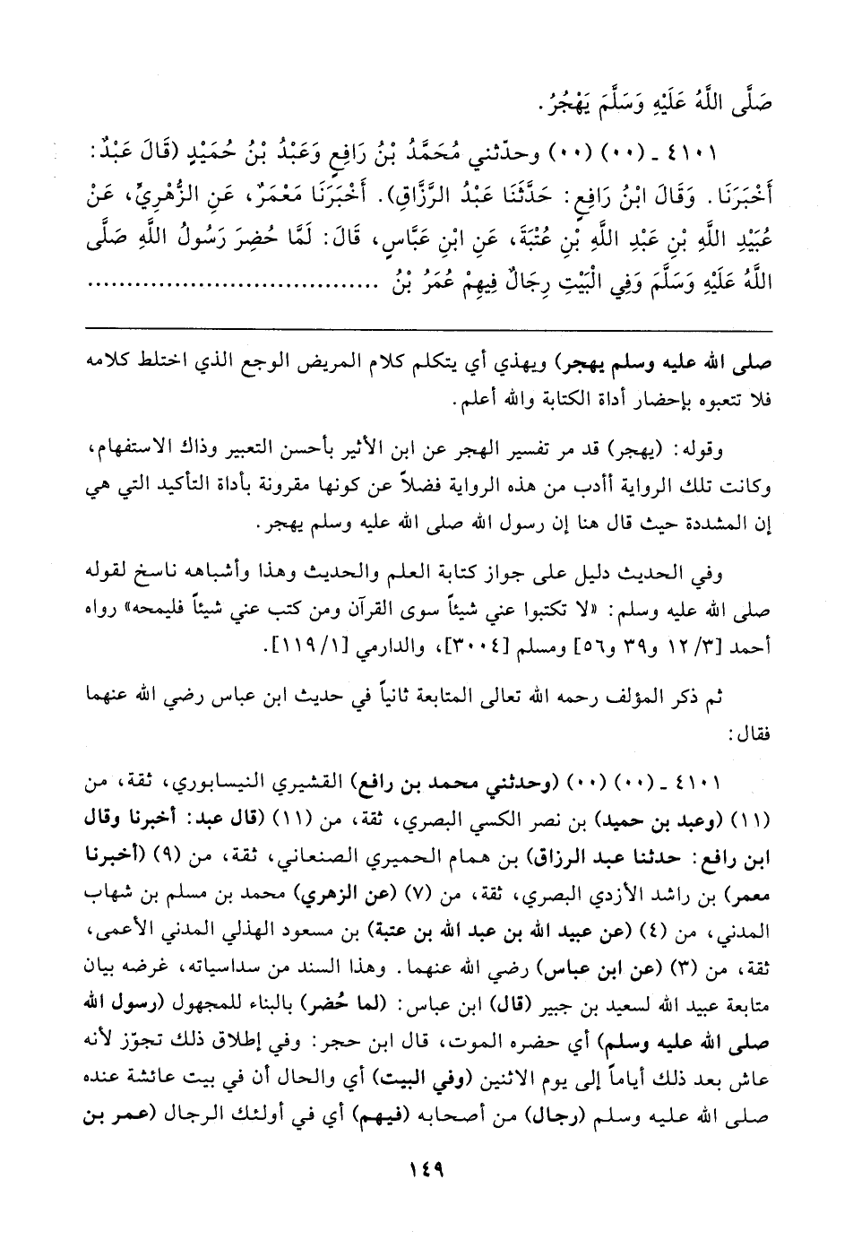 ٤١٠١ - (٠٠) (٠٠) (وحدثني محمد بن رافع) القشيري النيسابوري، ثقة، من (١١) (وعبد بن حميد) بن نصر الكسي البصري، ثقة، من (١١) (قال عبد: أخبرنا وقال ابن رافع: حدثنا عبد الرزاق) بن همام الحميري الصنعاني، ثقة، من (٩) (أخبرنا معمر) بن راشد الأزدي البصري، ثقة، من (٧) (عن الزهري) محمد بن مسلم بن شهاب المدني، من (٤) (عن عبيد الله بن عبد الله بن عتبة) بن مسعود الهذلي المدني الأعمى، ثقة، من (٣) (عن ابن عباس) رضي الله عنهما. وهذا السند من سداسياته، غرضه بيان متابعة عبيد الله لسعيد بن جبير (قال) ابن عباس: (لما حُضر) بالبناء للمجهول (رسول الله صلى الله عليه وسلم) أي حضره الموت، قال ابن حجر: وفي إطلاق ذلك تجوّز لأنه عاش بعد ذلك أيامًا إلى يوم الاثنين (وفي البيت) أي والحال أن في بيت عائشة عنده صلى الله عليه وسلم (رجال) من أصحابه (فيهم) أي في أولئك الرجال (عمر بن