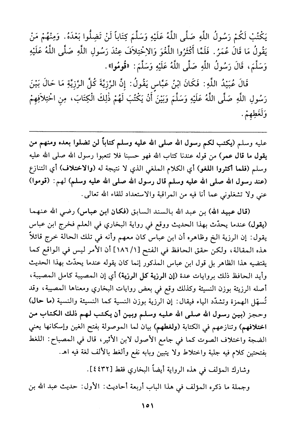 قَال عُبَيدُ اللهِ: فَكَانَ ابْنُ عَبَّاسٍ يَقُولُ: إِنَّ الرَّزِيَّةَ كُلَّ الرَّزِيَّةِ مَا حَال بَينَ رَسُولِ اللهِ صَلَّى اللهُ عَلَيهِ وَسَلَّمَ وَبَينَ أَنْ يَكْتُبَ لَهُمْ ذلِكَ الْكِتَابَ، مِنِ اخْتِلافِهِمْ وَلَغَطِهِمْ