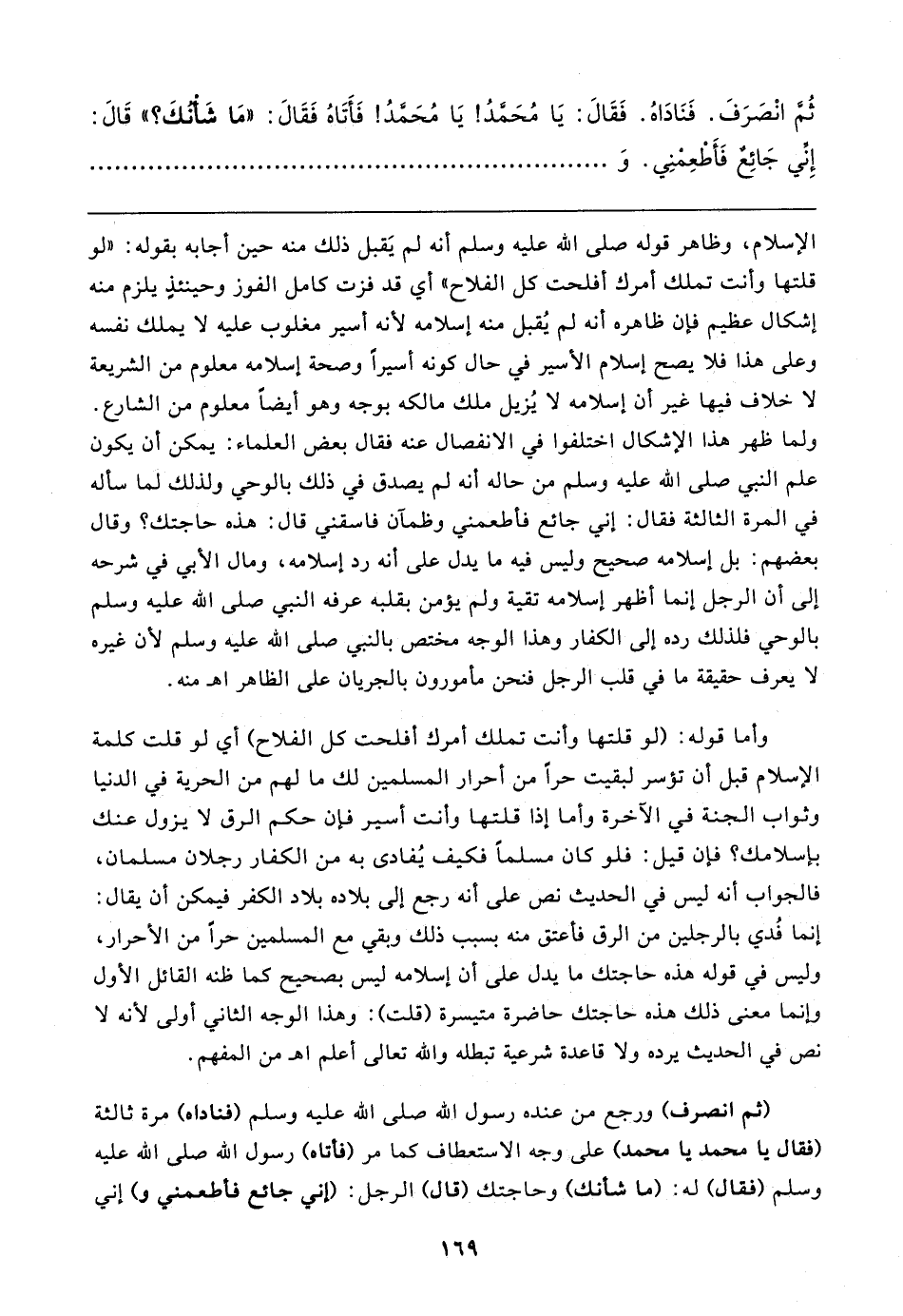 الإسلام، وظاهر قوله صلى الله عليه وسلم أنه لم يَقبل ذلك منه حين أجابه بقوله: "لو قلتها وأنت تملك أمرك أفلحت كل الفلاح" أي قد فزت كامل الفوز وحينئذٍ يلزم منه إشكال عظيم فإن ظاهره أنه لم يُقبل منه إسلامه لأنه أسير مغلوب عليه لا يملك نفسه وعلى هذا فلا يصح إسلام الأسير في حال كونه أسيرًا وصحة إسلامه معلوم من الشريعة لا خلاف فيها غير أن إسلامه لا يُزيل ملك مالكه بوجه وهو أيضًا معلوم من الشارع. ولما ظهر هذا الإشكال اختلفوا في الانفصال عنه فقال بعض العلماء: يمكن أن يكون علم النبي صلى الله عليه وسلم من حاله أنه لم يصدق في ذلك بالوحي ولذلك لما سأله في المرة الثالثة فقال: إني جائع فأطعمني وظمآن فاسقني قال: هذه حاجتك؟ وقال بعضهم: بل إسلامه صحيح وليس فيه ما يدل على أنه رد إسلامه، ومال الأبي في شرحه إلى أن الرجل إنما أظهر إسلامه تقية ولم يؤمن بقلبه عرفه النبي صلى الله عليه وسلم بالوحي فلذلك رده إلى الكفار وهذا الوجه مختص بالنبي صلى الله عليه وسلم لأن غيره لا يعرف حقيقة ما في قلب الرجل فنحن مأمورون بالجريان على الظاهر اهـ منه.