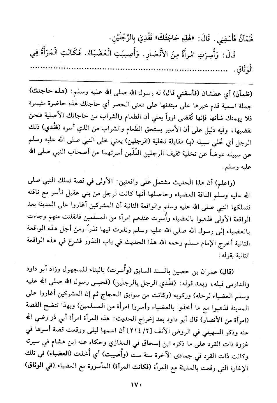 قَال: وَأُسِرَتِ امْرأَةٌ مِنَ الأَنْصَارِ. وَأُصِيبَتِ الْعَضْبَاءُ. فَكَانَتِ الْمَرْأَةُ في الْوَثَاقِ