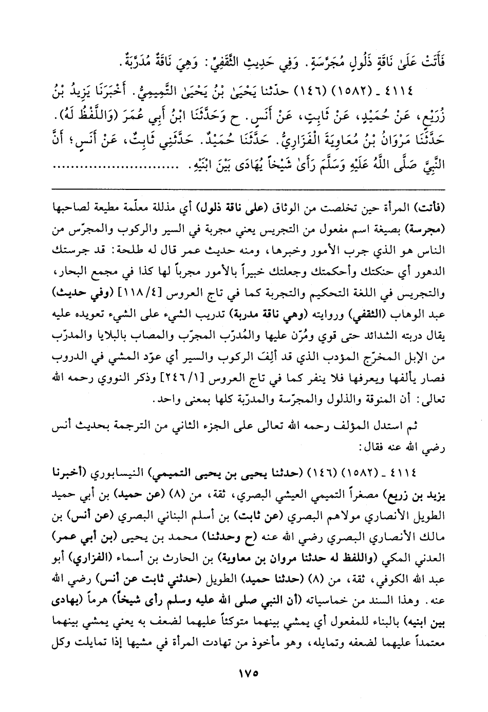 (فأتت) المرأة حين تخلصت من الوثاق (على ناقة ذلول) أي مذللة معلّمة مطيعة لصاحبها (مجرسة) بصيغة اسم مفعول من التجريس يعني مجربة في السير والركوب والمجرّس من الناس هو الذي جرب الأمور وخبرها، ومنه حديث عمر قال له طلحة: قد جرستك الدهور أي حنكتك وأحكمتك وجعلتك خبيرًا بالأمور مجربًا لها كذا في مجمع البحار، والتجريس في اللغة التحكيم والتجربة كما في تاج العروس [١١٨/ ٤] (وفي حديث) عبد الوهاب (الثقفي) وروايته (وهي ناقة مدربة) تدريب الشيء على الشيء تعويده عليه يقال دربته الشدائد حتى قوي ومُرّن عليها والمُدرّب المجرّب والمصاب بالبلايا والمدرّب من الإبل المخرّج المؤدب الذي قد ألِفَ الركوب والسير أي عوّد المشي في الدروب فصار يألفها ويعرفها فلا ينفر كما في تاج العروس [١/ ٢٤٦] وذكر النووي رحمه الله تعالى: أن المنوقة والذلول والمجرّسة والمدرّبة كلها بمعنى واحد.