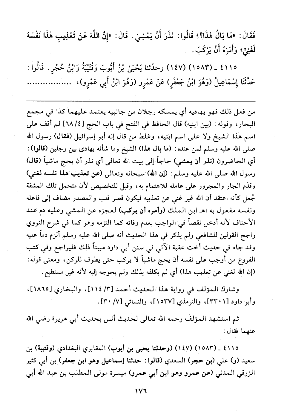 فَقَال: "مَا بَالُ هذَا؟ " قَالُوا: نَذَرَ أَنْ يَمْشِيَ. قَال: "إِن اللهَ عَنْ تَعْذِيبِ هذَا نَفْسَهُ لَغَنِيٌّ" وَأَمَرَهُ أَنْ يَرْكَبَ.