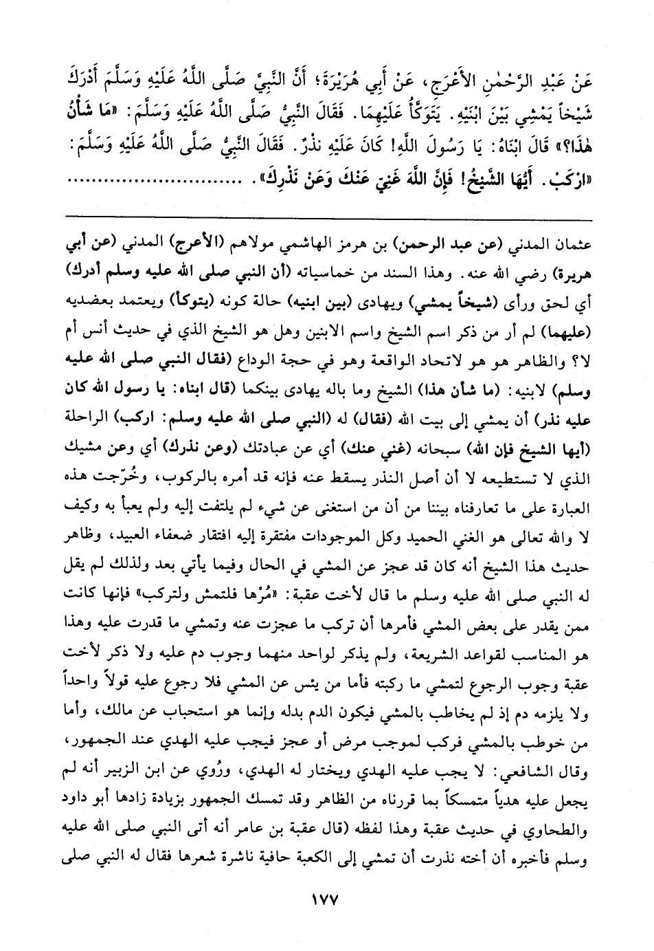 عَنْ عَبْدِ الرَّحْمنِ الأعرَجِ، عَنْ أَبِي هُرَيرَةَ؛ أَن النَّبِي - صلى الله عليه وسلم - أَدْرَكَ شَيخًا يَمْشِي بَينَ ابْنَيهِ. يَتَوَكَّأُ عَلَيهِمَا. فَقَال النَّبِي - صلى الله عليه وسلم -: "مَا شَأنُ هذَا؟ " قَال ابْنَاهُ: يَا رَسُولَ اللهِ! كَانَ عَلَيهِ نذْرٌ. فَقَال النَّبِيُّ - صلى الله عليه وسلم -: "ارْكَبْ. أَيُّهَا الشَّيخُ! فَإِن اللهَ غَنِيٌّ عَنْكَ وَعَن نَذْرِكَ"