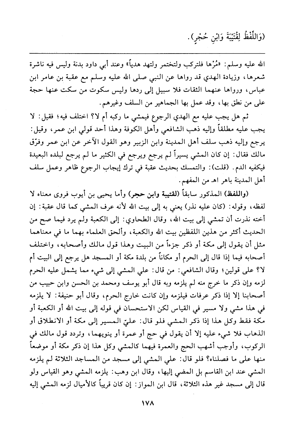(واللفظ) المذكور سابقًا (لقتيبة وابن حجر) وأما يحيى بن أيوب فروى معناه لا لفظه، وقوله: (كان عليه نذر) يعني به إلى بيت الله لأنه عرف المشي كما قال عقبة: إن أخته نذرت أن تمشي إلى بيت الله، وقال الطحاوي: إلى الكعبة ولم يرد فيما صح من الحديث أكثر من هذين اللفظين بيت الله والكعبة، وألحق العلماء بهما ما في معناهما مثل أن يقول إلى مكة أو ذكر جزءًا من البيت وهذا قول مالك وأصحابه، واختلف أصحابه فيما إذا قال إلى الحرم أو مكانًا من بلدة مكة أو المسجد هل يرجع إلى البيت أم لا؟ على قولين؛ وقال الشافعي: من قال: علي المشي إلى شيء مما يشمل عليه الحرم لزمه وإن ذكر ما خرج منه لم يلزمه وبه قال أبو يوسف ومحمد بن الحسن وابن حبيب من أصحابنا إلا إذا ذكر عرفات فيلزمه وإن كانت خارج الحرم، وقال أبو حنيفة: لا يلزمه في هذا مشي ولا مسير في القياس لكن الاستحسان في قوله إلى بيت الله أو الكعبة أو مكة فقط وكل هذا إذا ذكر المشي فلو قال: علي المسير إلى مكة أو الانطلاق أو الذهاب فلا شيء عليه إلا أن يقول في حج أو عمرة أو ينويهما، وتردد قول مالك في الركوب، وأوجب أشهب الحج والعمرة فيهما كالمشي وكل هذا إن ذكر مكة أو موضعًا منها على ما فصلناه؟ فلو قال: علي المشي إلى مسجد من المساجد الثلاثة لم يلزمه المشي عند ابن القاسم بل المضي إليها، وقال ابن وهب: يلزمه المشي وهو القياس ولو قال إلى مسجد غير هذه الثلاثة، قال ابن المواز: إن كان قريبًا كالأميال لزمه المشي إليه