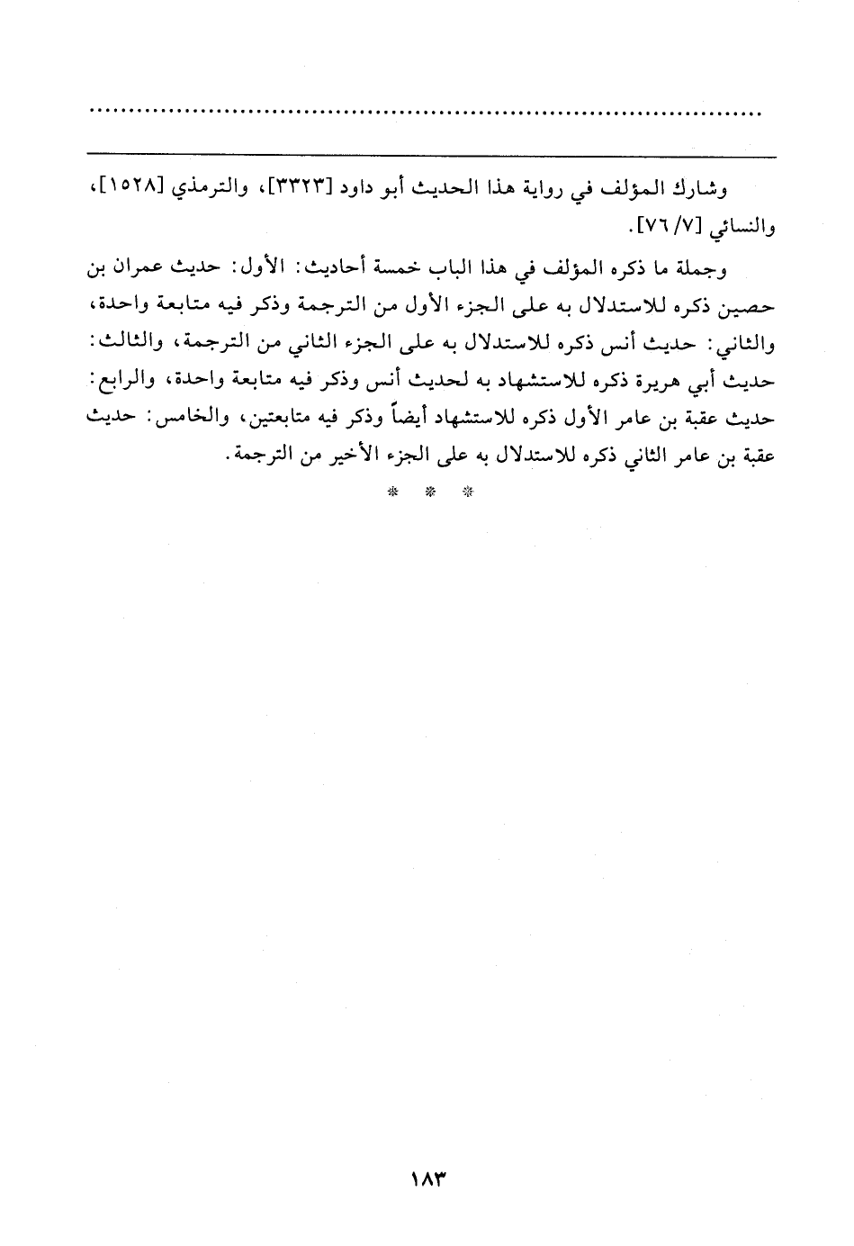 وجملة ما ذكره المؤلف في هذا الباب خمسة أحاديث: الأول: حديث عمران بن حصين ذكره للاستدلال به على الجزء الأول من الترجمة وذكر فيه متابعة واحدة، والثاني: حديث أنس ذكره للاستدلال به على الجزء الثاني من الترجمة، والثالث: حديث أبي هريرة ذكره للاستشهاد به لحديث أنس وذكر فيه متابعة واحدة، والرابع: حديث عقبة بن عامر الأول ذكره للاستشهاد أيضًا وذكر فيه متابعتين، والخامس: حديث عقبة بن عامر الثاني ذكره للاستدلال به على الجزء الأخير من الترجمة.