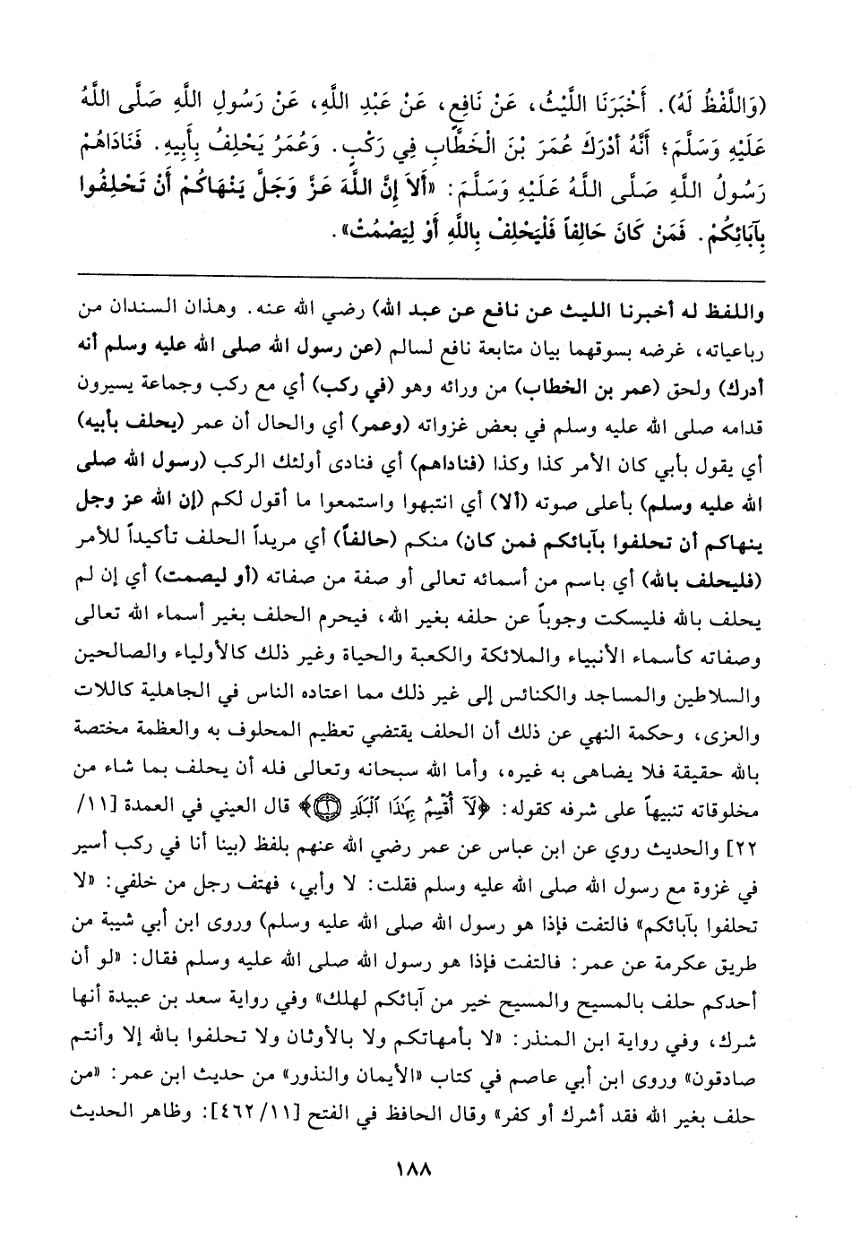 (وَاللَّفْظُ لَهُ). أَخْبَرَنَا اللَّيثُ، عَن نَافِعٍ، عَن عَبْدِ اللهِ، عَن رَسُولِ الله - صلى الله عليه وسلم - أَنَّهُ أدْرَكَ عُمَرَ بْنَ الْخَطَّابِ في رَكبٍ. وَعُمَرُ يَحْلِفُ بِأَبِيهِ. فَنَادَاهُمْ رَسُولُ الله - صلى الله عليه وسلم -: "أَلا إِن اللهَ عَزَّ وَجلَّ يَنْهَاكُمْ أَنْ تَحْلِفُوا بِآبَائِكُمْ. فَمَنْ كَانَ حَالِفًا فَلْيَحْلِفْ بِاللهِ أَوْ لِيَصْمُتْ"