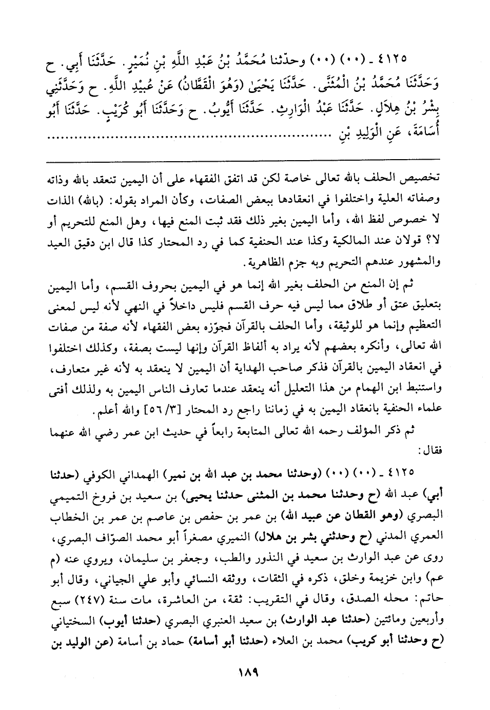 ٤١٢٥ - (٠٠) (٠٠) (وحدثنا محمد بن عبد الله بن نمير) الهمداني الكوفي (حدثنا أبي) عبد الله (ح وحدثنا محمد بن المثنى حدثنا يحيى) بن سعيد بن فروخ التميمي البصري (وهو القطان عن عبيد الله) بن عمر بن حفص بن عاصم بن عمر بن الخطاب العمري المدني (ح وحدثني بشر بن هلال) النميري مصغرًا أبو محمد الصوّاف البصري، روى عن عبد الوارث بن سعيد في النذور والطب، وجعفر بن سليمان، ويروي عنه (م عم) وابن خزيمة وخلق، ذكره في الثقات، ووثقه النسائي وأبو علي الجياني، وقال أبو حاتم: محله الصدق، وقال في التقريب: ثقة، من العاشرة، مات سنة (٢٤٧) سبع وأربعين ومائتين (حدثنا عبد الوارث) بن سعيد العنبري البصري (حدثنا أيوب) السختياني (ح وحدثنا أبو كريب) محمد بن العلاء (حدثنا أبو أسامة) حماد بن أسامة (عن الوليد بن