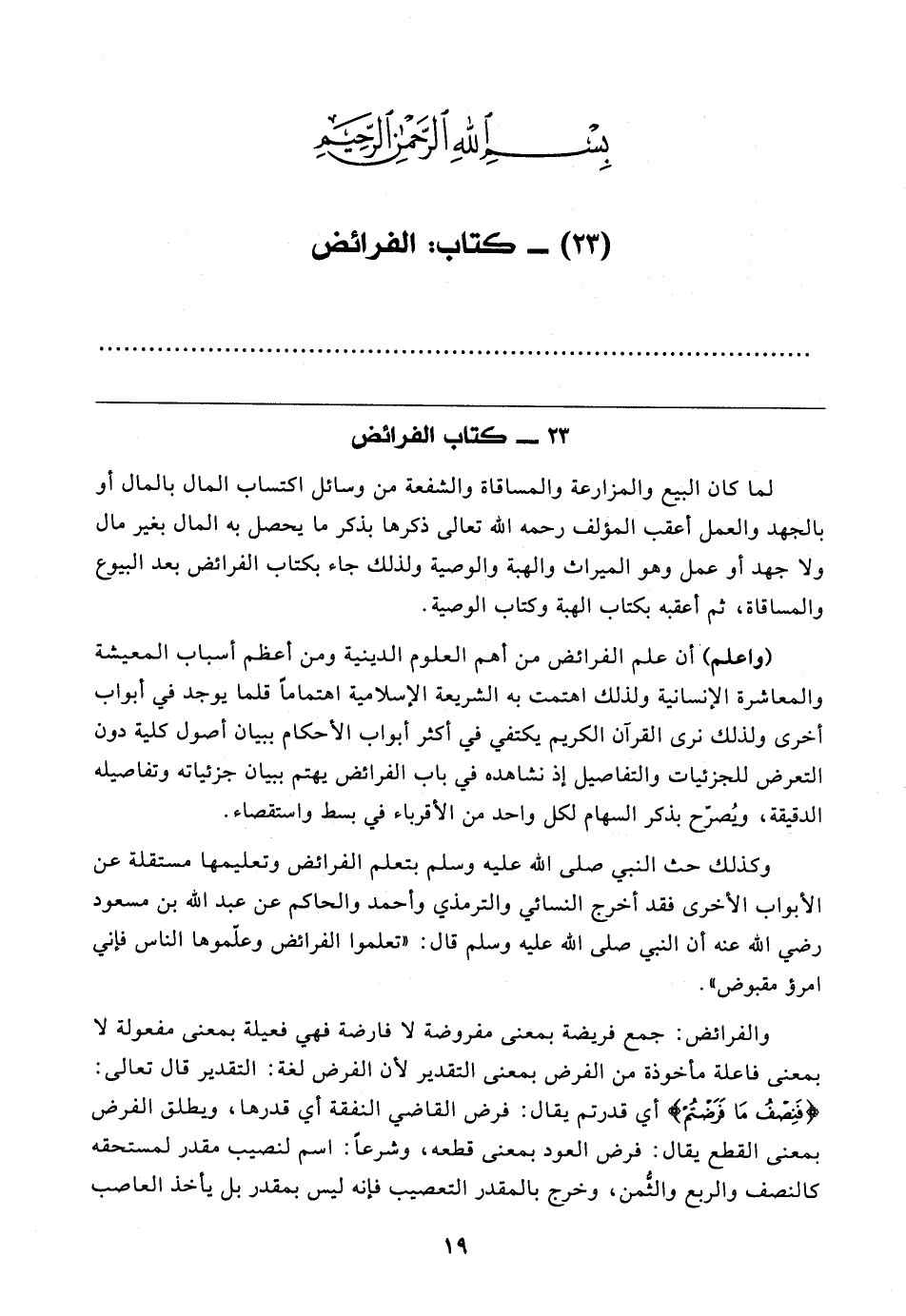 (واعلم) أن علم الفرائض من أهم العلوم الدينية ومن أعظم أسباب المعيشة والمعاشرة الإنسانية ولذلك اهتمت به الشريعة الإسلامية اهتمامًا قلما يوجد في أبواب أخرى ولذلك نرى القرآن الكريم يكتفي في أكثر أبواب الأحكام ببيان أصول كلية دون التعرض للجزئيات والتفاصيل إذ نشاهده في باب الفرائض يهتم ببيان جزئياته وتفاصيله الدقيقة، ويصرّح بذكر السهام لكل واحد من الأقرباء في بسط واستقصاء.