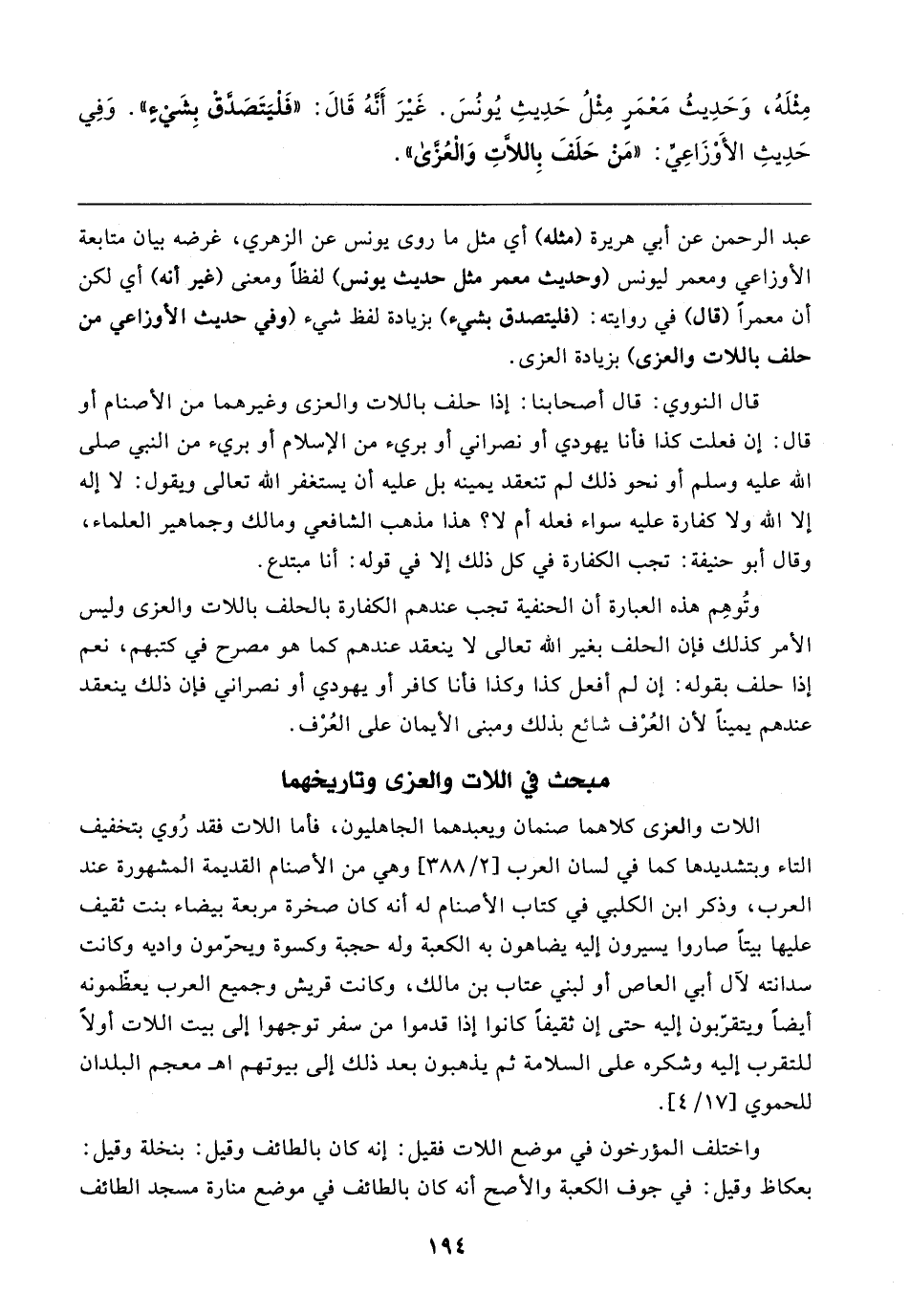 وتُوهِم هذه العبارة أن الحنفية تجب عندهم الكفارة بالحلف باللات والعزى وليس الأمر كذلك فإن الحلف بغير الله تعالى لا ينعقد عندهم كما هو مصرح في كتبهم، نعم إذا حلف بقوله: إن لم أفعل كذا وكذا فأنا كافر أو يهودي أو نصراني فإن ذلك ينعقد عندهم يمينًا لأن العُرْف شائع بذلك ومبنى الأيمان على العُرْف.
