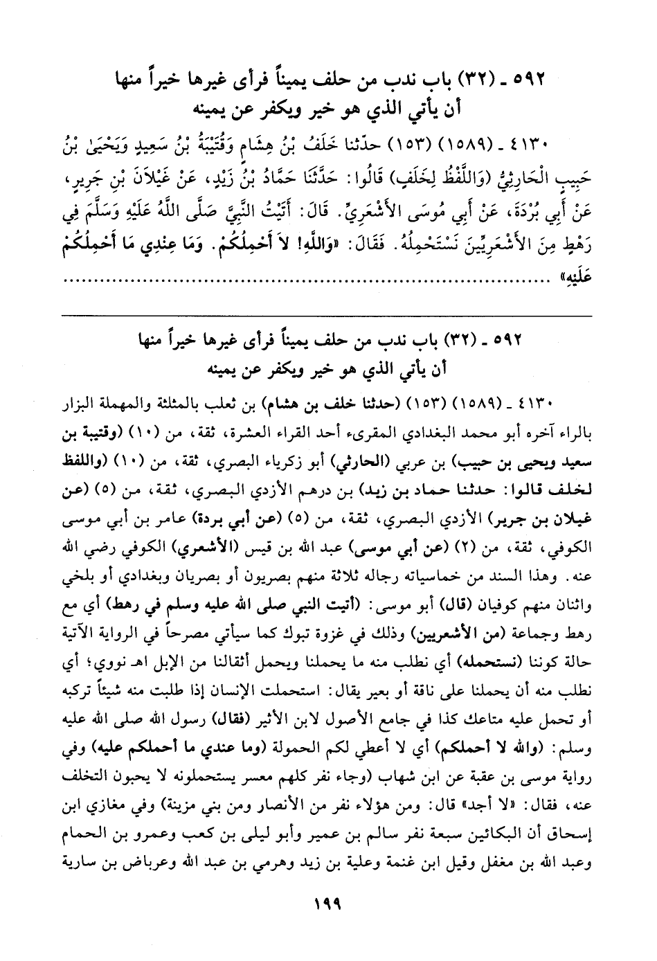 ٤١٣٠ - (١٥٨٩) (١٥٣) حدَّثنا خَلَفُ بْنُ هِشَامٍ وَقُتَيبَةُ بْنُ سَعِيدٍ وَيَحْيَى بْنُ حَبِيبٍ الْحَارِثِيُّ (وَاللَّفْظُ لِخَلَفٍ) قَالُوا: حَدَّثنَا حَمَّادُ بْنُ زَيدٍ، عَنْ غَيلانَ بْنِ جَرِيرٍ، عَنْ أَبِي بُرْدَةَ، عَنْ أَبِي مُوسَى الأشْعَرِيِّ. قَال: أَتَيتُ النَّبِيَّ - صلى الله عليه وسلم - في رَهْطٍ مِنَ الأشْعَرِيِّينَ نَسْتَحْمِلُهُ. فَقَال: "وَاللهِ! لَا أَحْمِلُكُمْ. وَمَا عِنْدِي مَا أَحْمِلُكُم عَلَيهِ"