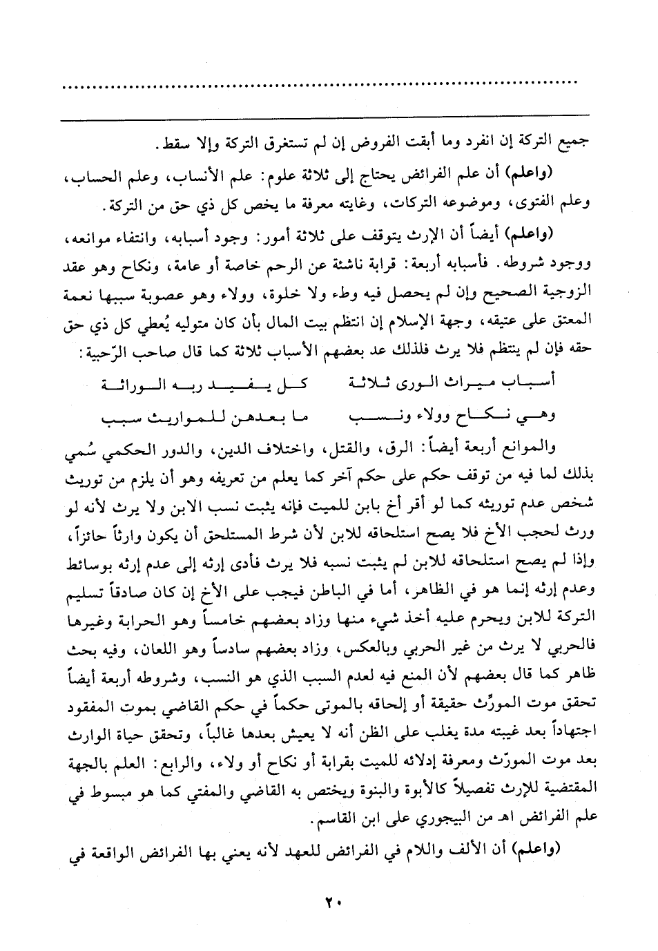 (واعلم) أن علم الفرائض يحتاج إلى ثلاثة علوم: علم الأنساب، وعلم الحساب، وعلم الفتوى، وموضوعه التركات، وغايته معرفة ما يخص كل ذي حق من التركة.