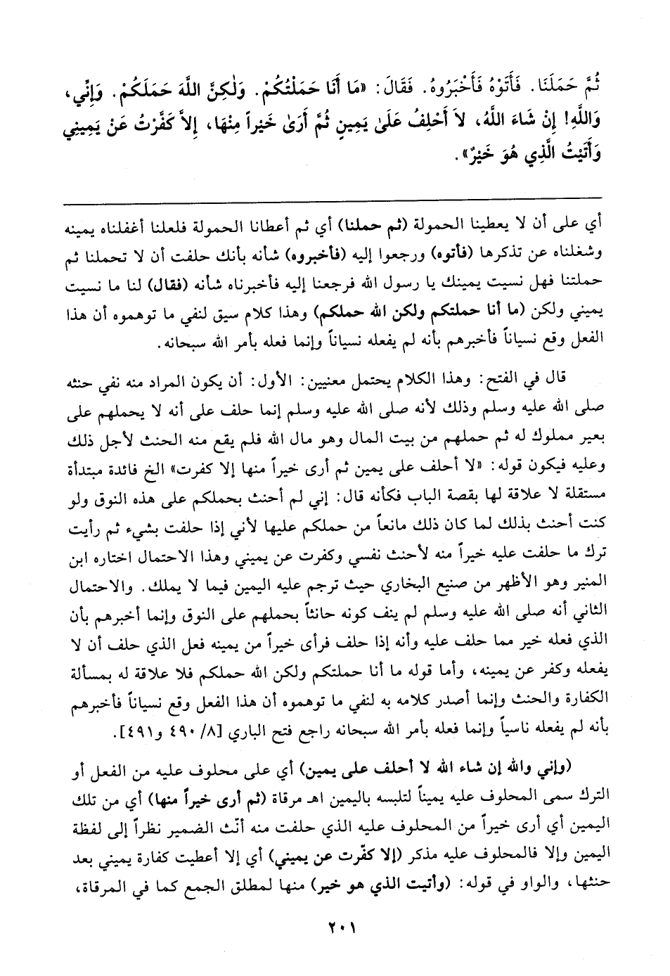 ثُمَّ حَمَلَنَا. فَأَتَوْهُ فَأَخْبَرُوهُ. فَقَال: "مَا أَنا حَمَلْتُكُمْ. وَلكِنَّ اللهَ حَمَلَكُمْ. وإنِّي، وَاللهِ! إِنْ شَاءَ اللهُ، لَا أَحْلِفُ عَلَى يَمِينِ ثُمَّ أَرَى خَيرًا مِنْهَا، إلا كَفرْتُ عَنْ يَمِينِي وَأتيتُ الذِي هُوَ خَيرٌ"