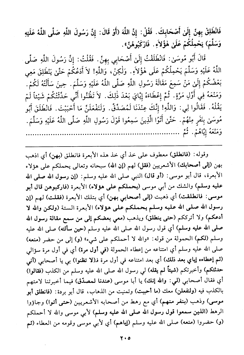 قَال أبُو مُوسَى: فَانْطَلَقْتُ إِلَى أَصْحَابِي بِهِنَّ. فَقُلْتُ: إِن رَسُول الله - صلى الله عليه وسلم - يَحْمِلُكُمْ عَلَى هؤُلاءِ. وَلكِنْ، وَاللهِ! لَا أَدَعُكُمْ حَتَّى يَنْطَلِقَ مَعِي بَعْضكُمْ إِلَى مَنْ سَمِعَ مَقَالةَ رَسُول اللهِ - صلى الله عليه وسلم -. حِينَ سَأَلْتُهُ لَكُمْ. وَمَنْعَهُ في أَوَّل مَرَّةٍ. ثُمَّ إِعْطَاءَهُ إِيَّايَ بَعْدَ ذلِكَ. لَا تَظُنُّوا أَنِّي حَدَّثتُكُمْ شَيئًا لَمْ يَقُلْهُ. فَقَالُوا لِي: وَاللهِ! إِنَّكَ عِنْدَنَا لَمُصدَّقٌ. وَلَنَفْعَلَنَّ مَا أَحْبَبْتَ. فَانْطَلَقَ أَبُو مُوسَى بِنَفَرٍ مِنْهُمْ. حَتَّى أَتَوُا الَّذِينَ سَمِعُوا قَوْل رَسُول الله - صلى الله عليه وسلم -. وَمَنْعَهُ إِياهُمْ. ثُمَّ