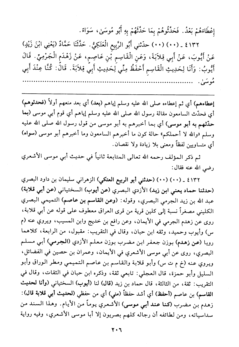 ٤١٣٢ - (٠٠) (٠٠) (حدثني أبو الربيع العتكي) الزهراني سليمان بن داود البصري (حدثنا حماد يعني ابن زيد) الأزدي البصري (عن أيوب) السختياني (عن أبي قلابة) عبد الله بن زيد الجرمي البصري، وقوله: (وعن القاسم بن عاصم) التميمي البصري الكليني مصغرًا نسبة إلى كلين قرية من قرى العراق معطوف على قوله عن أبي قلابة، روى عن زهدم الجرمي في الأيمان، وعن رافع بن خديج وابن المسيب، ويروي عنه (م س) وأيوب وحميد، وثقه ابن حبان، وقال في التقريب: مقبول، من الرابعة، كلاهما رويا (عن زهدم) بوزن جعفر ابن مضرب بوزن معلم الأزدي (الجرمي) أبي مسلم البصري، روى عن أبي موسى الأشعري في الأيمان، وعمران بن حصين في الفضائل، ويروي عنه (خ م ت س) وأبو قلابة والقاسم بن عاصم التميمي ومطر الوراق وأبو السليل وأبو حمزة، قال العجلي: تابعي ثقة، وذكره ابن حبان في الثقات، وقال في التقريب: ثقة، من الثالثة، قال حماد بن زيد (قال) لنا (أيوب) السختياني (وأنا لحديث القاسم) بن عاصم (أحفظ) أي أشد حفظًا (مني) أي من حفظي الحديث أبي قلابة قال): زهدم بن مضرب كنا عند أبي موسى) الأشعري يومًا من الأيام. وهذا السند من سداسياته، ومن لطائفه أن رجاله كلهم بصريون إلا أبا موسى الأشعري، وفيه رواية
