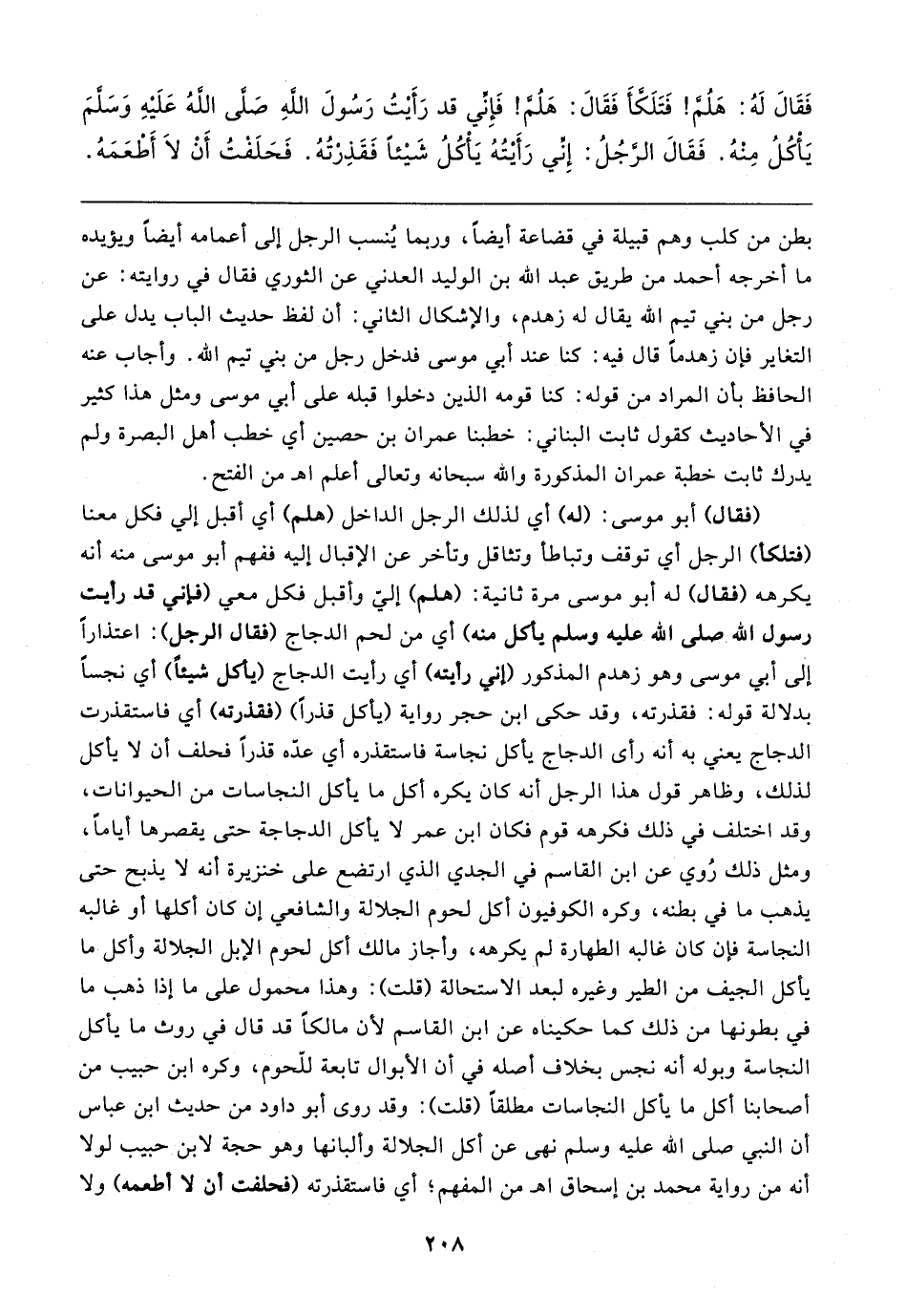 بطن من كلب وهم قبيلة في قضاعة أيضًا، وربما يُنسب الرجل إلى أعمامه أيضًا ويؤيده ما أخرجه أحمد من طريق عبد الله بن الوليد العدني عن الثوري فقال في روايته: عن رجل من بني تيم الله يقال له زهدم، والإشكال الثاني: أن لفظ حديث الباب يدل على التغاير فإن زهدمًا قال فيه: كنا عند أبي موسى فدخل رجل من بني تيم الله. وأجاب عنه الحافظ بأن المراد من قوله: كنا قومه الذين دخلوا قبله على أبي موسى ومثل هذا كثير في الأحاديث كقول ثابت البناني: خطبنا عمران بن حصين أي خطب أهل البصرة ولم يدرك ثابت خطبة عمران المذكورة والله سبحانه وتعالى أعلم اهـ من الفتح. (فقال) أبو موسى: (له) أي لذلك الرجل الداخل (هلم) أي أقبل إلي فكل معنا (فتلكأ) الرجل أي توقف وتباطأ وتثاقل وتأخر عن الإقبال إليه ففهم أبو موسى منه أنه يكرهه (فقال) له أبو موسى مرة ثانية: (هلم) إليّ وأقبل فكل معي (فإني قد رأيت رسول الله - صلى الله عليه وسلم - يأكل منه) أي من لحم الدجاج (فقال الرجل): اعتذارًا إلى أبي موسى وهو زهدم المذكور (إني رأيته) أي رأيت الدجاج (يأكل شيئًا) أي نجسًا بدلالة قوله: فقذرته، وقد حكى ابن حجر رواية (يأكل قذرًا) (فقذرته) أي فاستقذرت الدجاج يعني به أنه رأى الدجاج يأكل نجاسة فاستقذره أي عذه قذرًا فحلف أن لا يأكل لذلك، وظاهر قول هذا الرجل أنه كان يكره أكل ما يأكل النجاسات من الحيوانات، وقد اختلف في ذلك فكرهه قوم فكان ابن عمر لا يأكل الدجاجة حتى يقصرها أيامًا، ومثل ذلك رُوي عن ابن القاسم في الجدي الذي ارتضع على خنزيرة أنه لا يذبح حتى يذهب ما في بطنه، وكره الكوفيون أكل لحوم الجلالة والشافعي إن كان أكلها أو غالبه النجاسة فإن كان غالبه الطهارة لم يكرهه، وأجاز مالك أكل لحوم الإبل الجلالة وأكل ما يأكل الجيف من الطير وغيره لبعد الاستحالة (قلت): وهذا محمول على ما إذا ذهب ما في بطونها من ذلك كما حكيناه عن ابن القاسم لأن مالكًا قد قال في روث ما يأكل النجاسة وبوله أنه نجس بخلاف أصله في أن الأبوال تابعة للّحوم، وكره ابن حبيب من أصحابنا أكل ما يأكل النجاسات مطلقًا (قلت): وقد روى أبو داود من حديث ابن عباس أن النبي صلى الله عليه وسأنهى عن أكل الجلالة وألبانها وهو حجة لابن حبيب لولا أنه من رواية محمد بن إسحاق اهـ من المفهم؛ أي فاستقذرته (فحلفت أن لا أطعمه) ولا
