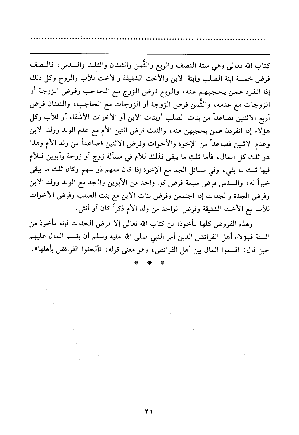 وهذه الفروض كلها مأخوذة من كتاب الله تعالى إلا فرض الجدات فإنه مأخوذ من السنة فهؤلاء أهل الفرائض الذين أمر النبي صلى الله عليه وسلم أن يقسم المال عليهم حين قال: اقسموا المال بين أهل الفرائض، وهو معنى قوله: "ألحقوا الفرائض بأهلها".
