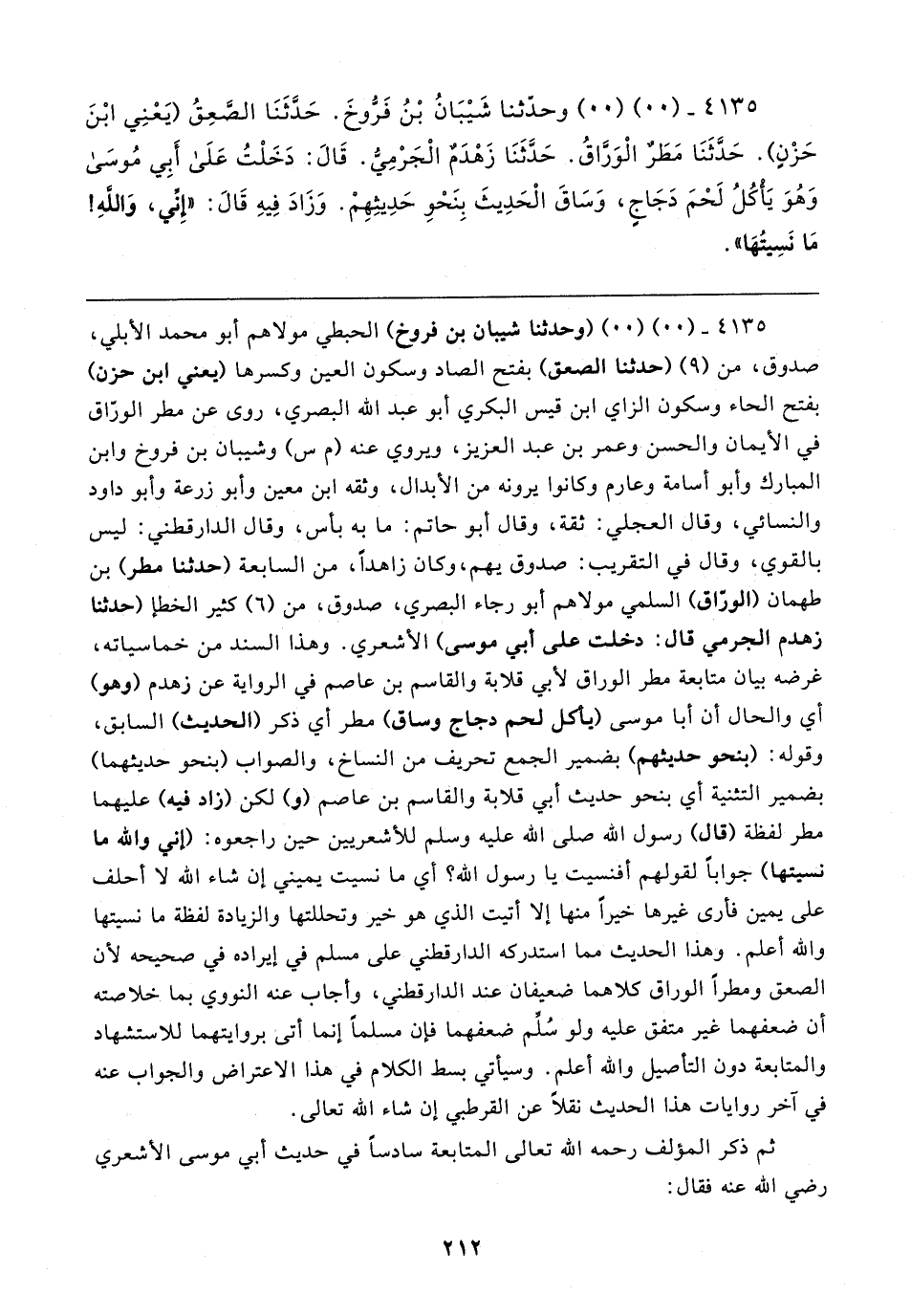 ٤١٣٥ - (٠٠) (٠٠) وحدثنا شيبان بن فروخ) الحبطي مولاهم أبو محمد الأبلي، صدوق، من (٩) (حدثنا الصعق) بفتح الصاد وسكون العين وكسرها (يعني ابن حزن) بفتح الحاء وسكون الزاي ابن قيس البكري أبو عبد الله البصري، روى عن مطر الورّاق في الأيمان والحسن وعمر بن عبد العزيز، ويروي عنه (م س) وشيبان بن فروخ وابن المبارك وأبو أسامة وعارم وكانوا يرونه من الأبدال، وثقه ابن معين وأبو زرعة وأبو داود والنسائي، وقال العجلي: ثقة، وقال أبو حاتم: ما به بأس، وقال الدارقطني: ليس بالقوي، وقال في التقريب: صدوق يهم، وكان زاهدًا، من السابعة (حدثنا مطر) بن طهمان (الورّاق) السلمي مولاهم أبو رجاء البصري، صدوق، من (٦) كثير الخطإ (حدثنا زهدم الجرمي قال: دخلت على أبي موسى) الأشعري. وهذا السند من خماسياته، غرضه بيان متابعة مطر الوراق لأبي قلابة والقاسم بن عاصم في الرواية عن زهدم (وهو) أي والحال أن أبا موسى (يأكل لحم دجاج وساق) مطر أي ذكر (الحديث) السابق، وقوله: (بنحو حديثهم) بضمير الجمع تحريف من النساخ، والصواب (بنحو حديثهما) بضمير التثنية أي بنحو حديث أبي قلابة والقاسم بن عاصم (و) لكن (زاد فيه) عليهما مطر لفظة (قال) رسول الله صلى الله عليه وسلم للأشعريين حين راجعوه: (إني والله ما نسيتها) جوابًا لقولهم أفنسيت يا رسول الله؟ أي ما نسيت يميني إن شاء الله لا أحلف على يمين فأرى غيرها خيرًا منها إلا أتيت الذي هو خير وتحللتها والزيادة لفظة ما نسيتها والله أعلم. وهذا الحديث مما استدركه الدارقطني على مسلم في إيراده في صحيحه لأن الصعق ومطرًا الوراق كلاهما ضعيفان عند الدارقطني، وأجاب عنه النووي بما خلاصته أن ضعفهما غير متفق عليه ولو سُلِّم ضعفهما فإن مسلمًا إنما أتى بروايتهما للاستشهاد والمتابعة دون التأصيل والله أعلم. وسيأتي بسط الكلام في هذا الاعتراض والجواب عنه في آخر روايات هذا الحديث نقلًا عن القرطبي إن شاء الله تعالى.