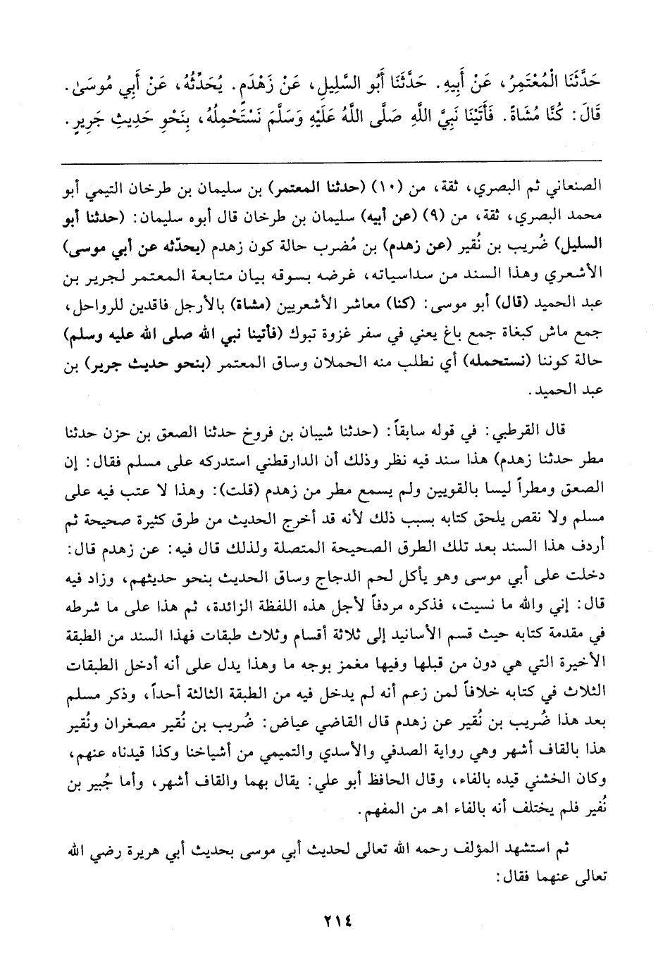 قال القرطبي: في قوله سابقًا: (حدثنا شيبان بن فروخ حدثنا الصعق بن حزن حدثنا مطر حدثنا زهدم) هذا سند فيه نظر وذلك أن الدارقطني استدركه على مسلم فقال: إن الصعق ومطرًا ليسا بالقويين ولم يسمع مطر من زهدم (قلت): وهذا لا عتب فيه على مسلم ولا نقص يلحق كتابه بسبب ذلك لأنه قد أخرج الحديث من طرق كثيرة صحيحة ثم أردف هذا السند بعد تلك الطرق الصحيحة المتصلة ولذلك قال فيه: عن زهدم قال: دخلت على أبي موسى وهو يأكل لحم الدجاج وساق الحديث بنحو حديثهم، وزاد فيه قال: إني والله ما نسيت، فذكره مردفًا لأجل هذه اللفظة الزائدة، ثم هذا على ما شرطه في مقدمة كتابه حيث قسم الأسانيد إلى ثلاثة أقسام وثلاث طبقات فهذا السند من الطبقة الأخيرة التي هي دون من قبلها وفيها مغمز بوجه ما وهذا يدل على أنه أدخل الطبقات الثلاث في كتابه خلافًا لمن زعم أنه لم يدخل فيه من الطبقة الثالثة أحدًا، وذكر مسلم بعد هذا ضريب بن نُقير عن زهدم قال القاضي عياض: ضريب بن نُقير مصغران ونُقير هذا بالقاف أشهر وهي رواية الصدفي والأسدي والتميمي من أشياخنا وكذا قيدناه عنهم، وكان الخشني قيده بالفاء، وقال الحافظ أبو علي: يقال بهما والقاف أشهر، وأما جُبير بن نُفير فلم يختلف أنه بالفاء اهـ من المفهم.