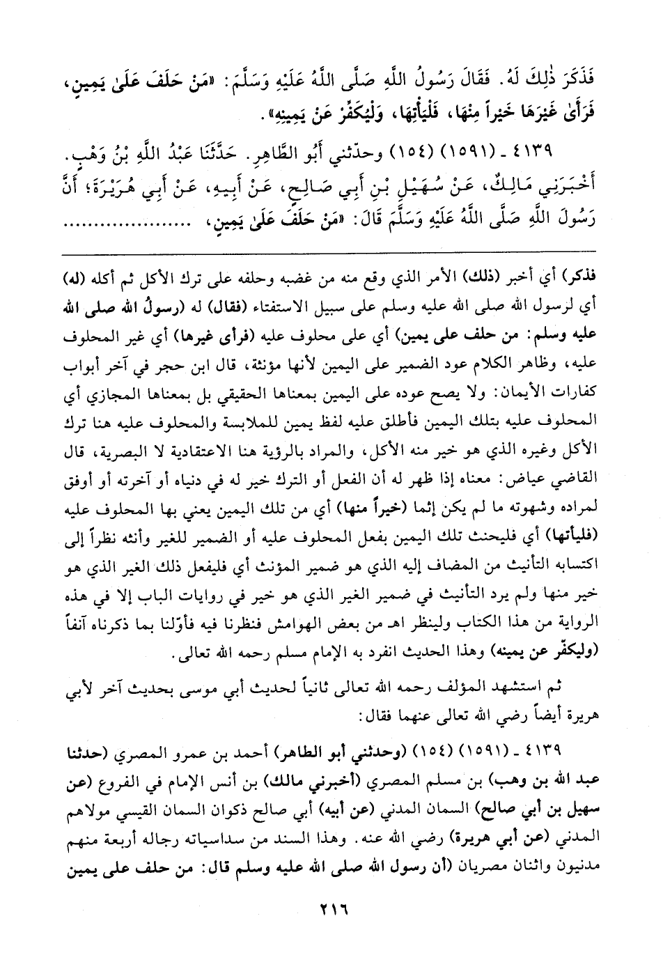 ٤١٣٩ - (١٥٩١) (١٥٤) (وحدثني أبو الطاهر) أحمد بن عمرو المصري (حدثنا عبد الله بن وهب) بن مسلم المصري (أخبرني مالك) بن أنس الإمام في الفروع (عن سهيل بن أبي صالح) السمان المدني (عن أبيه) أبي صالح ذكوان السمان القيسي مولاهم المدني (عن أبي هريرة) رضي الله عنه. وهذا السند من سداسياته رجاله أربعة منهم مدنيون واثنان مصريان (أن رسول الله صلى الله عليه وسلم قال: من حلف على يمين