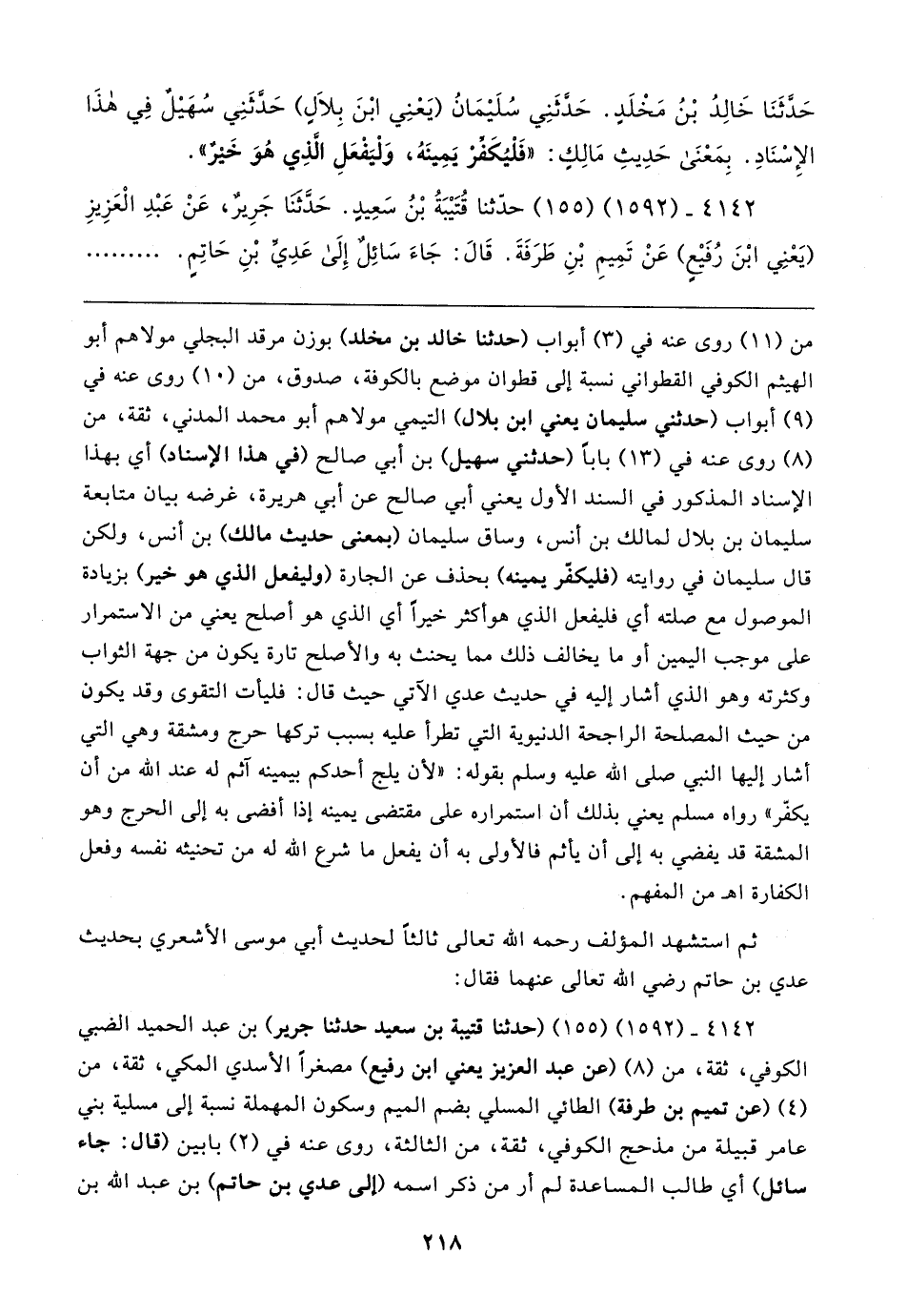 من (١١) روى عنه في (٣) أبواب (حدثنا خالد بن مخلد) بوزن مرقد البجلي مولاهم أبو الهيثم الكوفي القطواني نسبة إلى قطوان موضع بالكوفة، صدوق، من (١٠) روى عنه في (٩) أبواب (حدثني سليمان يعني ابن بلال) التيمي مولاهم أبو محمد المدني، ثقة، من (٨) روى عنه في (١٣) بابا (حدثني سهيل) بن أبي صالح (في هذا الإسناد) أي بهذا الإسناد المذكور في السند الأول يعني أبي صالح عن أبي هريرة، غرضه بيان متابعة سليمان بن بلال لمالك بن أنس، وساق سليمان (بمعنى حديث مالك) بن أنس، ولكن قال سليمان في روايته (فليكفّر يمينه) بحذف عن الجارة (وليفعل الذي هو خير) بزيادة الموصول مع صلته أي فليفعل الذي هو أكثر خيرًا أي الذي هو أصلح يعني من الاستمرار على موجب اليمين أو ما يخالف ذلك مما يحنث به والأصلح تارة يكون من جهة الثواب وكثرته وهو الذي أشار إليه في حديث عدي الآتي حيث قال: فليأت التقوى وقد يكون من حيث المصلحة الراجحة الدنيوية التي تطرأ عليه بسبب تركها حرج ومشقة وهي التي أشار إليها النبي صلى الله عليه وسلم بقوله: "لأن يلج أحدكم بيمينه آثم له عند الله من أن يكفّر" رواه مسلم يعني بذلك أن استمراره على مقتضى يمينه إذا أفضى به إلى الحرج وهو المشقة قد يفضي به إلى أن يأثم فالأولى به أن يفعل ما شرع الله له من تحنيثه نفسه وفعل الكفارة اهـ من المفهم.
