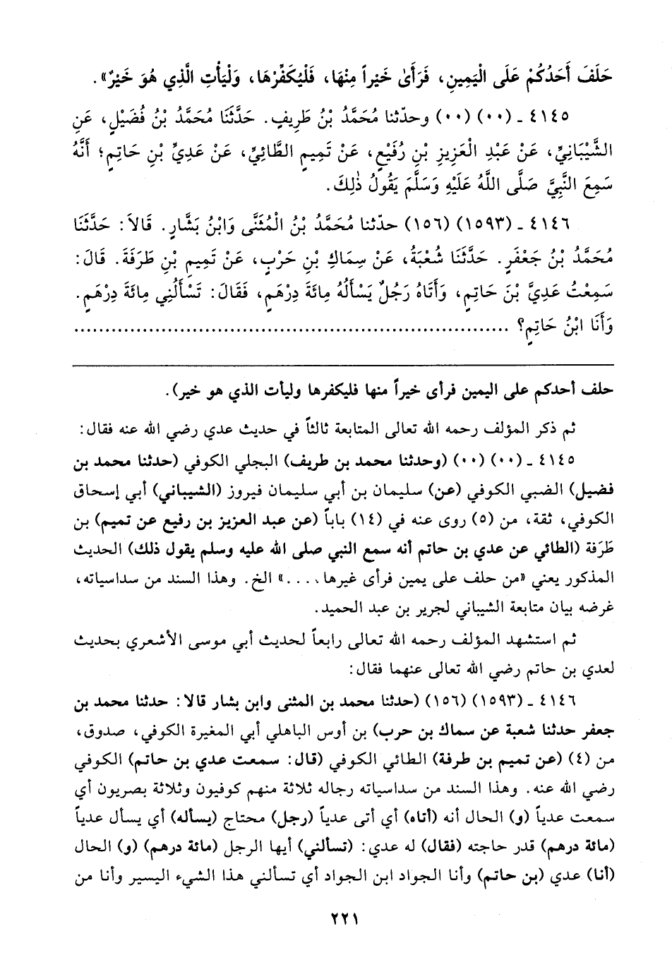 ٤١٤٥ - (٠٠) (٠٠) (وحدثنا محمد بن طريف) البجلي الكوفي (حدثنا محمد بن فضيل) الضبي الكوفي (عن) سليمان بن أبي سليمان فيروز (الشيباني) أبي إسحاق الكوفي، ثقة، من (٥) روى عنه في (١٤) بابا (عن عبد العزيز بن رفيع عن تميم) بن طَرَفة (الطائي عن عدي بن حاتم أنه سمع النبي صلى الله عليه وسلم يقول ذلك) الحديث المذكور يعني "من حلف على يمين فرأى غيرها ... "الخ. وهذا السند من سداسياته، غرضه بيان متابعة الشيباني لجرير بن عبد الحميد.