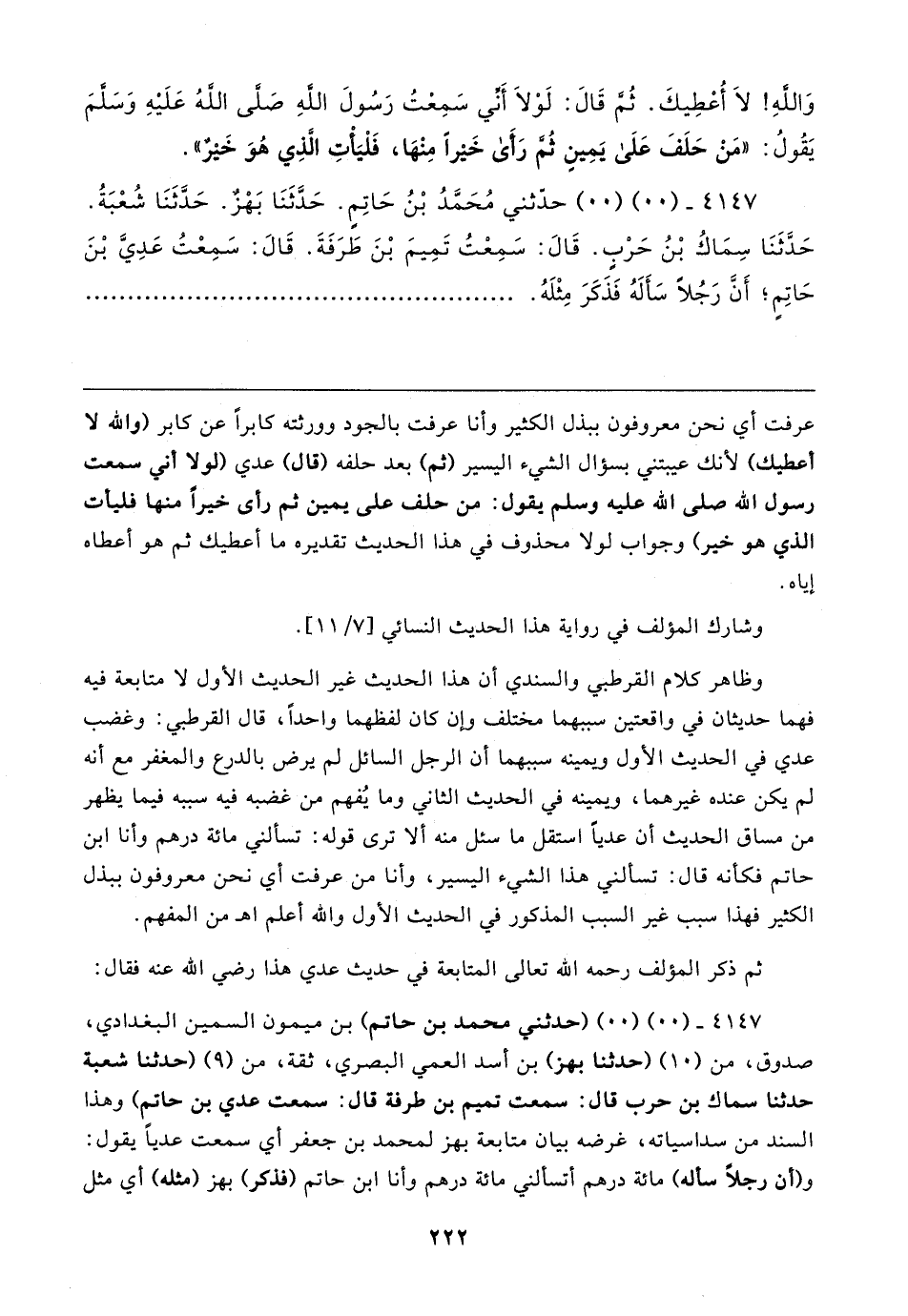 ٤١٤٧ - (٠٠) (٠٠) (حدثني محمد بن حاتم) بن ميمون السمين البغدادي، صدوق، من (١٠) (حدثنا بهز) بن أسد العمي البصري، ثقة، من (٩) (حدثنا شعبة حدثنا سماك بن حرب قال: سمعت تميم بن طرفة قال: سمعت عدي بن حاتم) وهذا السند من سداسياته، غرضه بيان متابعة بهز لمحمد بن جعفر أي سمعت عديًا يقول: و (أن رجلًا سأله) مائة درهم أتسألني مائة درهم وأنا ابن حاتم (فذكر) بهز (مثله) أي مثل