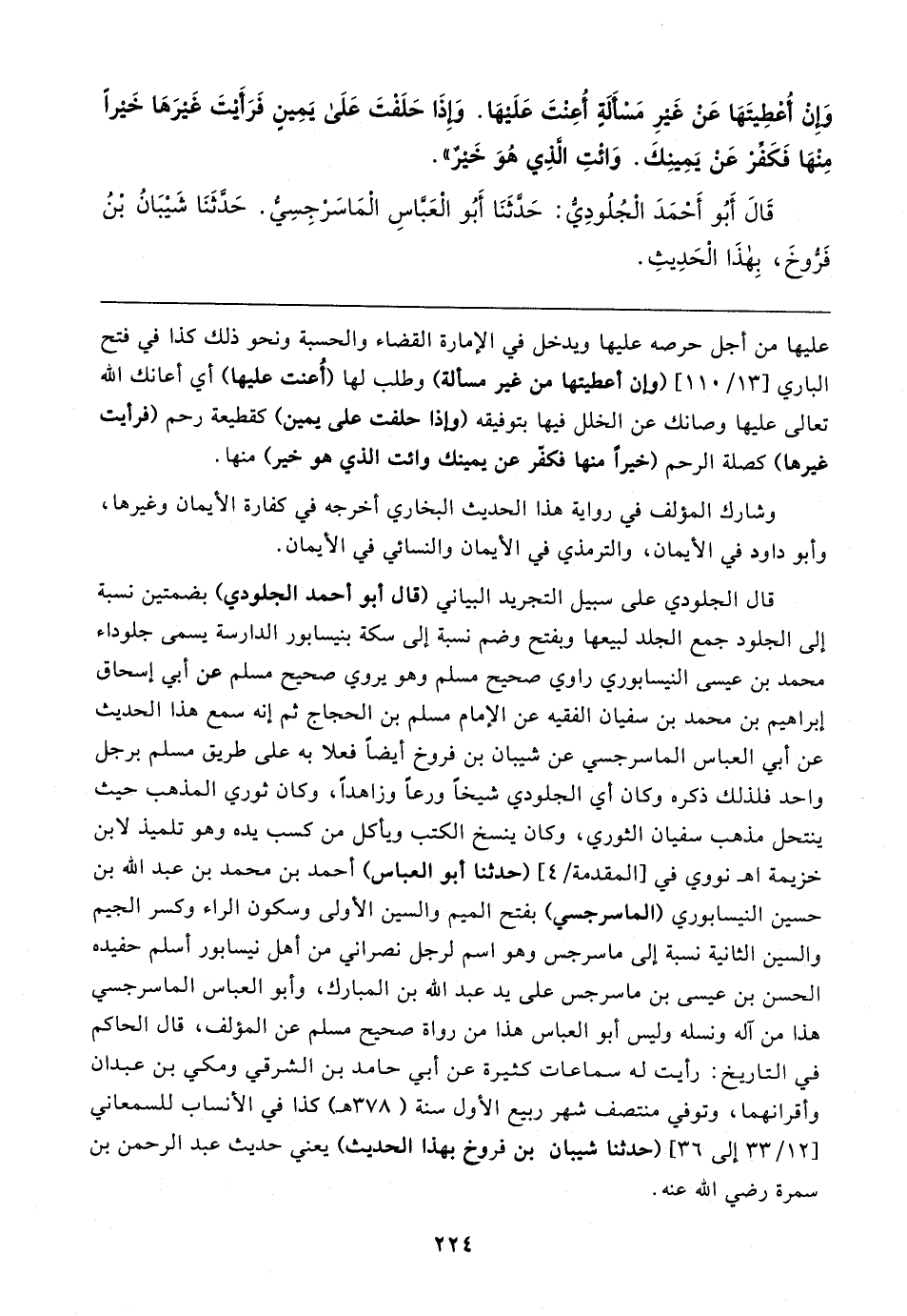 قال الجلودي على سبيل التجريد البياني (قال أبو أحمد الجلودي) بضمتين نسبة إلى الجلود جمع الجلد لبيعها وبفتح وضم نسبة إلى سكة بنيسابور الدارسة يسمى جلوداء محمد بن عيسى النيسابوري راوي صحيح مسلم وهو يروي صحيح مسلم عن أبي إسحاق إبراهيم بن محمد بن سفيان الفقيه عن الإمام مسلم بن الحجاج ثم إنه سمع هذا الحديث عن أبي العباس الماسرجسي عن شيبان بن فروخ أيضًا فعلا به على طريق مسلم برجل واحد فلذلك ذكره وكان أي الجلودي شيخًا ورعًا وزاهدًا، وكان ثوري المذهب حيث ينتحل مذهب سفيان الثوري، وكان ينسخ الكتب ويأكل من كسب يده وهو تلميذ لابن خزيمة اهـ نووي في [المقدمة / ٤] (حدثنا أبو العباس) أحمد بن محمد بن عبد الله بن حسين النيسابوري (الماسرجسي) بفتح الميم والسين الأولى وسكون الراء وكسر الجيم والسين الثانية نسبة إلى ماسرجس وهو اسم لرجل نصراني من أهل نيسابور أسلم حفيده الحسن بن عيسى بن ماسرجس على يد عبد الله بن المبارك، وأبو العباس الماسرجسي هذا من آله ونسله وليس أبو العباس هذا من رواة صحيح مسلم عن المؤلف، قال الحاكم في التاريخ: رأيت له سماعات كثيرة عن أبي حامد بن الشرقي ومكي بن عبدان وأقرانهما، وتوفي منتصف شهر ربيع الأول سنة (٣٧٨ هـ) كذا في الأنساب للسمعاني [١٢/ ٣٣ إلى ٣٦] (حدثنا شيبان بن فروخ بهذا الحديث) يعني حديث عبد الرحمن بن سمرة رضي الله عنه.