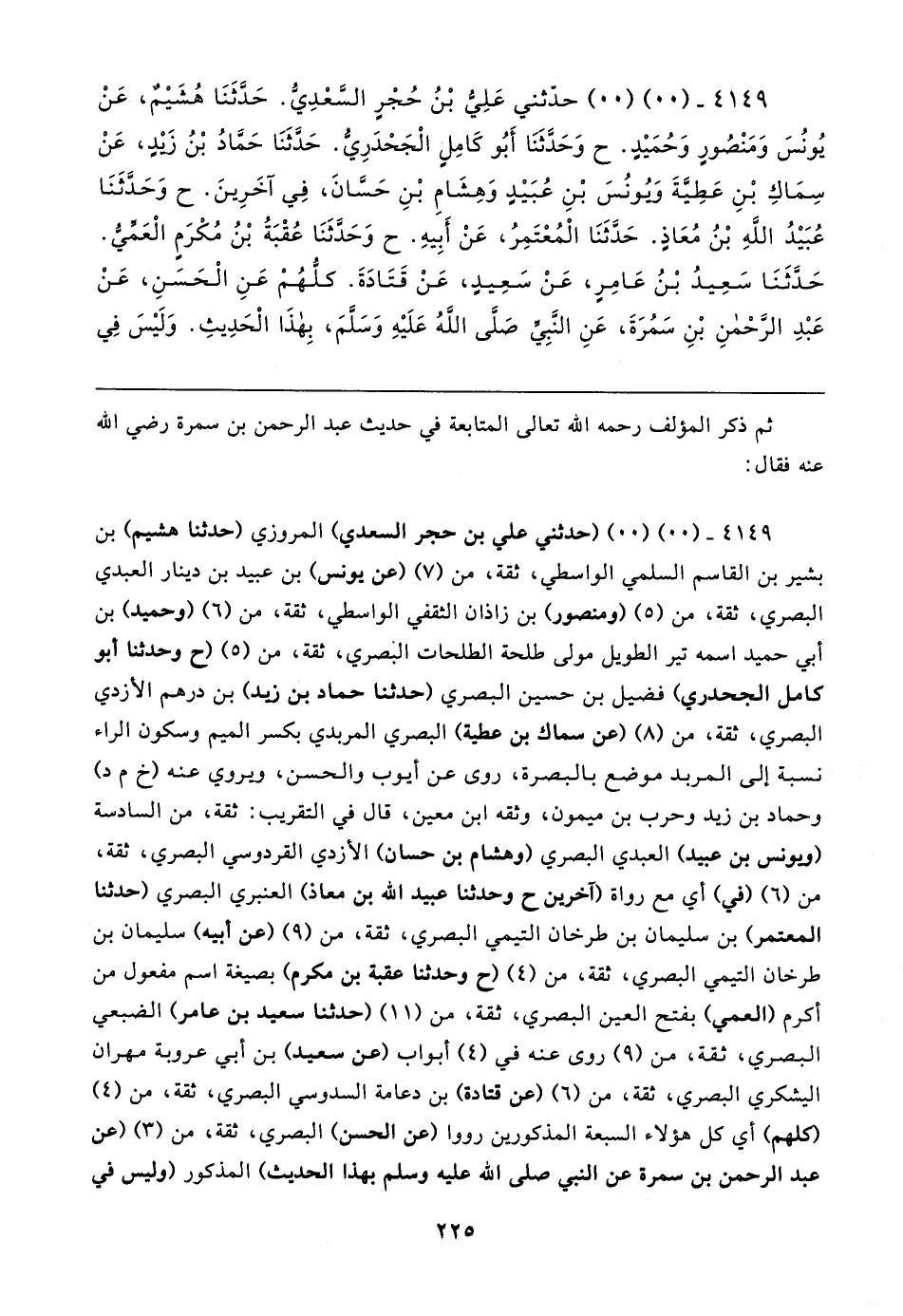 ٤١٤٩ - (٠٠) (٠٠) (حدثني علي بن حجر السعدي) المروزي (حدثنا هشيم) بن بشير بن القاسم السلمي الواسطي، ثقة، من (٧) (عن يونس) بن عبيد بن دينار العبدي البصري، ثقة، من (٥) (ومنصور) بن زاذان الثقفي الواسطي، ثقة، من (٦) (وحميد) بن أبي حميد اسمه تير الطويل مولى طلحة الطلحات البصري، ثقة، من (٥) (ح وحدثنا أبو كامل الجحدري) فضيل بن حسين البصري (حدثنا حماد بن زيد) بن درهم الأزدي البصري، ثقة، من (٨) (عن سماك بن عطية) البصري المربدي بكسر الميم وسكون الراء نسبة إلى المربد موضع بالبصرة، روى عن أيوب والحسن، ويروي عنه (خ م د) وحماد بن زيد وحرب بن ميمون، وثقه ابن معين، قال في التقريب: ثقة، من السادسة (ويونس بن عبيد) العبدي البصري (وهشام بن حسان) الأزدي القردوسي البصري، ثقة، من (٦) (في) أي مع رواة (آخرين ح وحدثنا عبيد الله بن معاذ) العنبري البصري (حدثنا المعتمر) بن سليمان بن طرخان التيمي البصري، ثقة، من (٩) (عن أبيه) سليمان بن طرخان التيمي البصري، ثقة، من (٤) (ح وحدثنا عقبة بن مكرم) بصيغة اسم مفعول من أكرم (العمي) بفتح العين البصري، ثقة، من (١١) (حدثنا سعيد بن عامر) الضبعي البصري، ثقة، من (٩) روى عنه في (٤) أبواب (عن سعيد) بن أبي عروبة مهران اليشكري البصري، ثقة، من (٦) (عن قتادة) بن دعامة السدوسي البصري، ثقة، من (٤) كلهم) أي كل هؤلاء السبعة المذكورين رووا (عن الحسن) البصري، ثقة، من (٣) (عن عبد الرحمن بن سمرة عن النبي صلى الله عليه وسلم بهذا الحديث) المذكور (وليس في