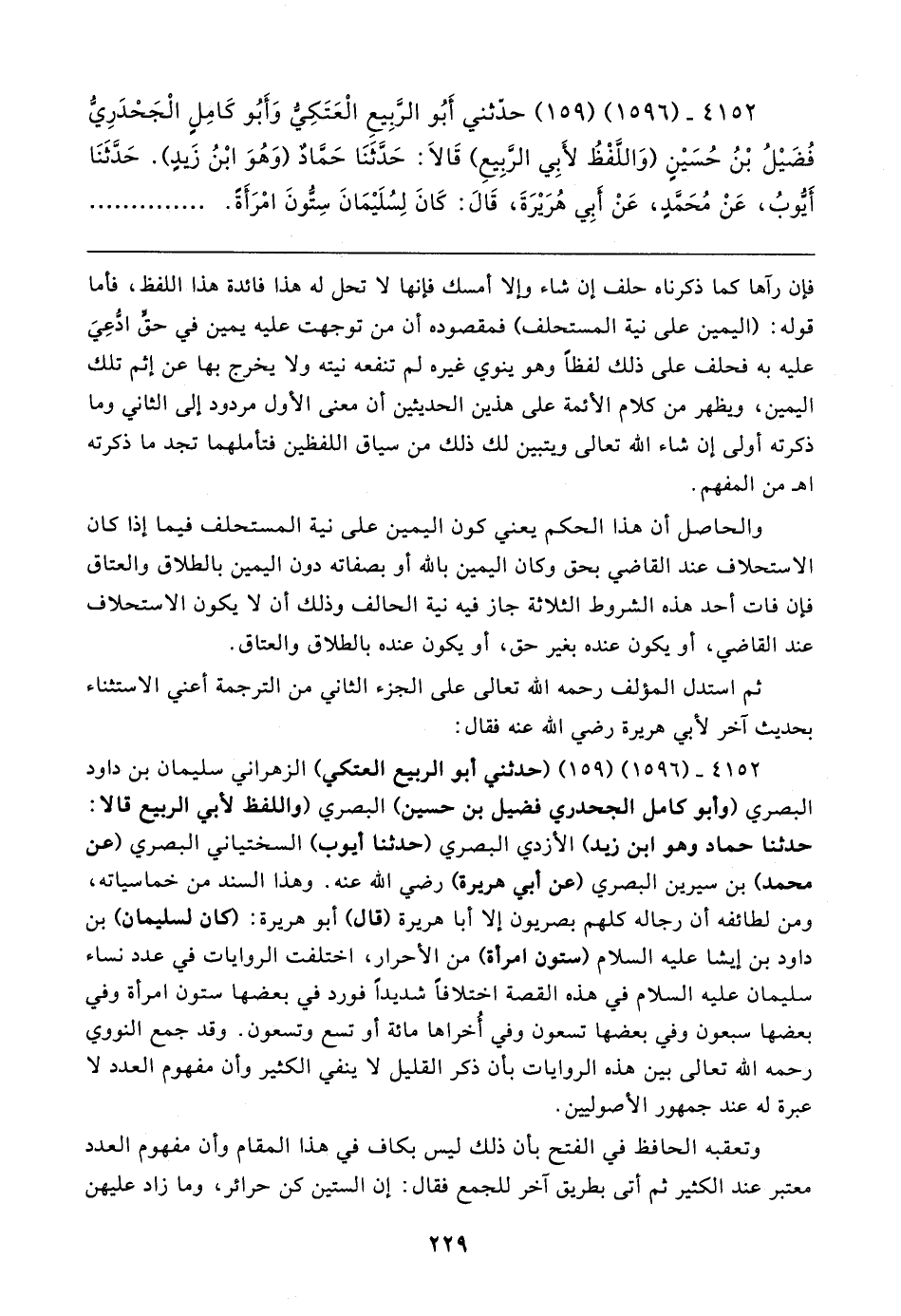 ٤١٥٢ - (١٥٩٦) (١٥٩) (حدثني أبو الربيع العتكي) الزهراني سليمان بن داود البصري (وأبو كامل الجحدري فضيل بن حسين) البصري (واللفظ لأبي الربيع قالا: حدثنا حماد وهو ابن زيد) الأزدي البصري (حدثنا أيوب) السختياني البصري (عن محمد) بن سيرين البصري (عن أبي هريرة) رضي الله عنه. وهذا السند من خماسياته، ومن لطائفه أن رجاله كلهم بصريون إلا أبا هريرة (قال) أبو هريرة: (كان لسليمان) بن داود بن إيشا - عليه السلام - (ستون امرأة) من الأحرار، اختلفت الروايات في عدد نساء سليمان - عليه السلام - في هذه القصة اختلافًا شديدًا فورد في بعضها ستون امرأة وفي بعضها سبعون وفي بعضها تسعون وفي أخراها مائة أو تسع وتسعون. وقد جمع النووي رحمه الله تعالى بين هذه الروايات بان ذكر القليل لا ينفي الكثير وأن مفهوم العدد لا عبرة له عند جمهور الأصوليين.