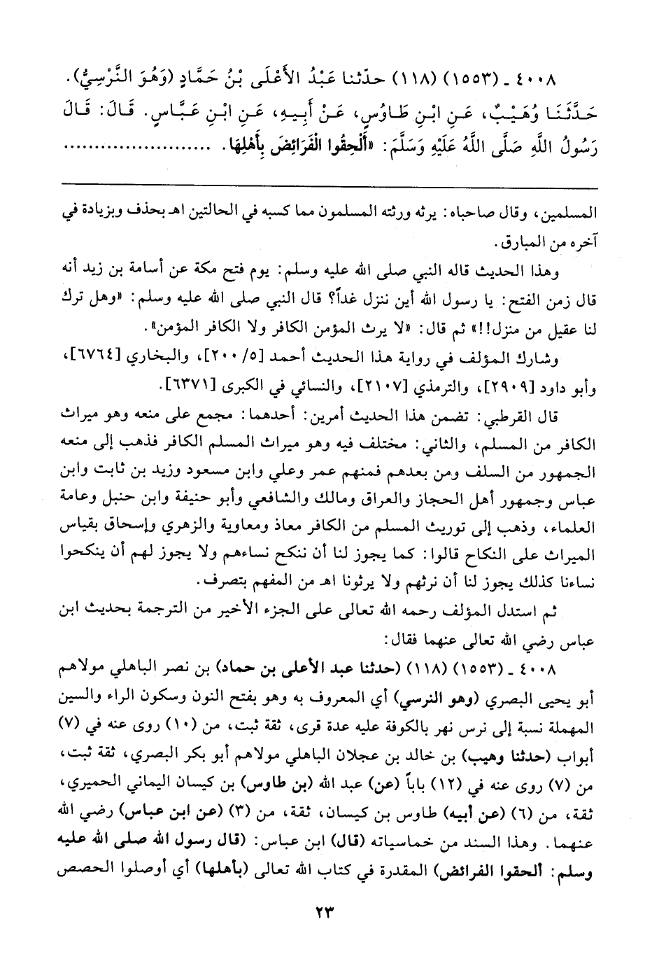 ٤٠٠٨ - (١٥٥٣) (١١٨) (حدثنا عبد الأعلى بن حماد) بن نصر الباهلي مولاهم أبو يحيى البصري (وهو النرسي) أي المعروف به وهو بفتح النون وسكون الراء والسين المهملة نسبة إلى نرس نهر بالكوفة عليه عدة قرى، ثقة ثبت، من (١٠) روى عنه في (٧) أبواب (حدثنا وهيب) بن خالد بن عجلان الباهلي مولاهم أبو بكر البصري، ثقة ثبت، من (٧) روى عنه في (١٢) بابا (عن) عبد الله (بن طاوس) بن كيسان اليماني الحميري، ثقة، من (٦) (عن أبيه) طاوس بن كيسان، ثقة، من (٣) (عن ابن عباس) رضي الله عنهما. وهذا السند من خماسياته (قال) ابن عباس: (قال رسول الله صلى الله عليه وسلم: ألحقوا الفرائض) المقدرة في كتاب الله تعالى (بأهلها) أي أوصلوا الحصص