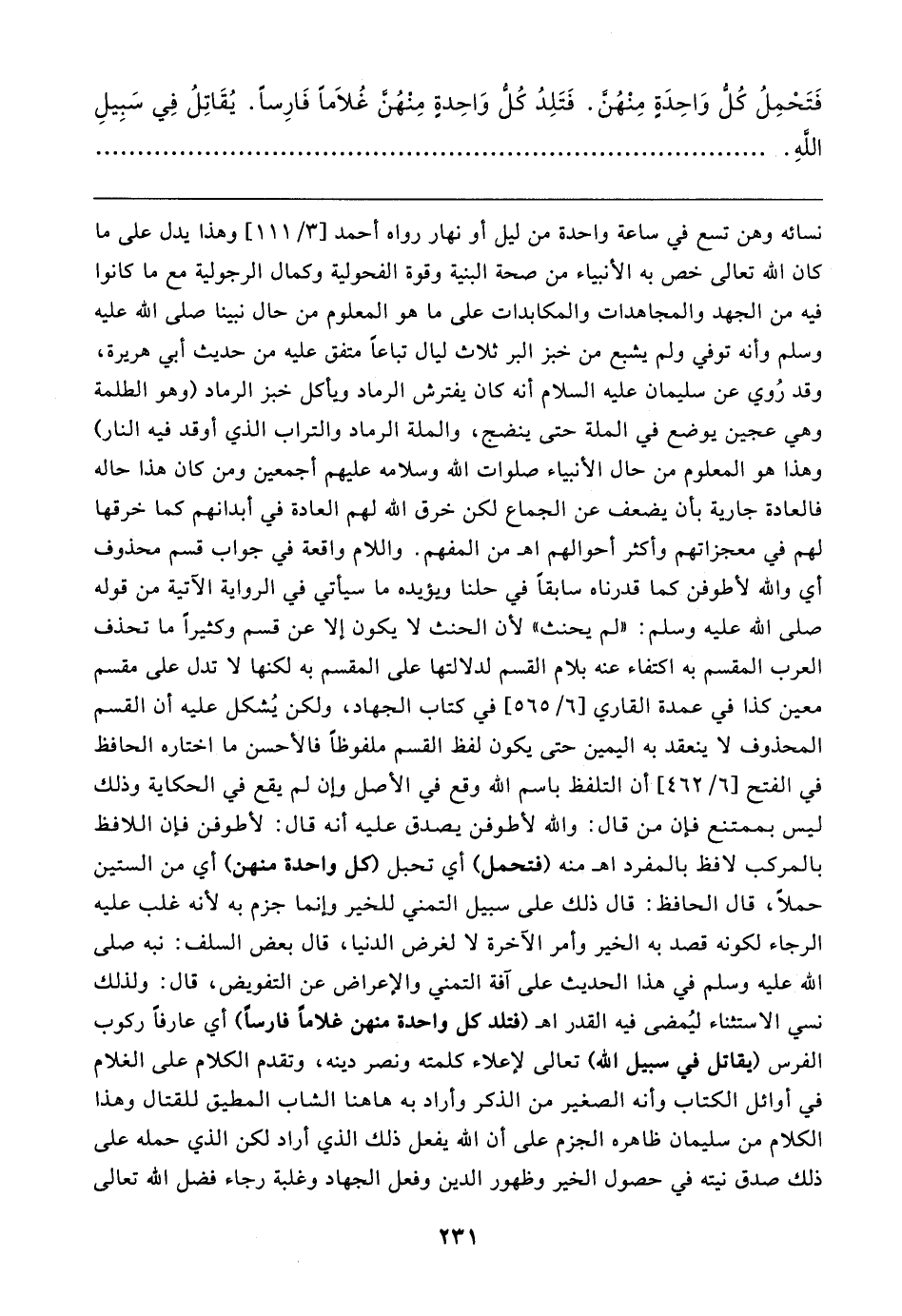 نسائه وهن تسع في ساعة واحدة من ليل أو نهار رواه أحمد [٣/ ١١١] وهذا يدل على ما كان الله تعالى خص به الأنبياء من صحة البنية وقوة الفحولية وكمال الرجولية مع ما كانوا فيه من الجهد والمجاهدات والمكابدات على ما هو المعلوم من حال نبينا صلى الله عليه وسلم وأنه توفي ولم يشبع من خبز البر ثلاث ليال تباعًا متفق عليه من حديث أبي هريرة، وقد رُوي عن سليمان - عليه السلام - أنه كان يفترش الرماد ويأكل خبز الرماد (وهو الطلمة وهي عجين يوضع في الملة حتى ينضج، والملة الرماد والتراب الذي أوقد فيه النار) وهذا هو المعلوم من حال الأنبياء صلوات الله وسلامه عليهم أجمعين ومن كان هذا حاله فالعادة جارية بأن يضعف عن الجماع لكن خرق الله لهم العادة في أبدانهم كما خرقها لهم في معجزاتهم وأكثر أحوالهم اهـ من المفهم. واللام واقعة في جواب قسم محذوف أي والله لأطوفن كما قدرناه سابقًا في حلنا ويؤيده ما سيأتي في الرواية الآتية من قوله صلى الله عليه وسلم: "لم يحنث" لأن الحنث لا يكون إلا عن قسم وكثيرًا ما تحذف العرب المقسم به اكتفاء عنه بلام القسم لدلالتها على المقسم به لكنها لا تدل على مقسم معين كذا في عمدة القاري [٦/ ٥٦٥] في كتاب الجهاد، ولكن يُشكل عليه أن القسم المحذوف لا ينعقد به اليمين حتى يكون لفظ القسم ملفوظًا فالأحسن ما اختاره الحافظ في الفتح [٦/ ٤٦٢] أن التلفظ باسم الله وقع في الأصل وإن لم يقع في الحكاية وذلك ليس بممتنع فإن من قال: والله لأطوفن يصدق عليه أنه قال: لأطوفن فإن اللافظ بالمركب لافظ بالمفرد اهـ منه (فتحمل) أي تحبل (كل واحدة منهن) أي من الستين حملًا، قال الحافظ: قال ذلك على سبيل التمني للخير وإنما جزم به لأنه غلب عليه الرجاء لكونه قصد به الخير وأمر الآخرة لا لغرض الدنيا، قال بعض السلف: نبه صلى الله عليه وسلم في هذا الحديث على آفة التمني والإعراض عن التفويض، قال: ولذلك نسي الاستثناء ليُمضى فيه القدر اهـ (فتلد كل واحدة منهن كلامًا فارسًا) أي عارفا ركوب الفرس (يقاتل في سبيل الله) تعالى لإعلاء كلمته ونصر دينه، وتقدم الكلام على الغلام في أوائل الكتاب وأنه الصغير من الذكر وأراد به هاهنا الشاب المطيق للقتال وهذا الكلام من سليمان ظاهره الجزم على أن الله يفعل ذلك الذي أراد لكن الذي حمله على ذلك صدق نيته في حصول الخير وظهور الدين وفعل الجهاد وغلبة رجاء فضل الله تعالى