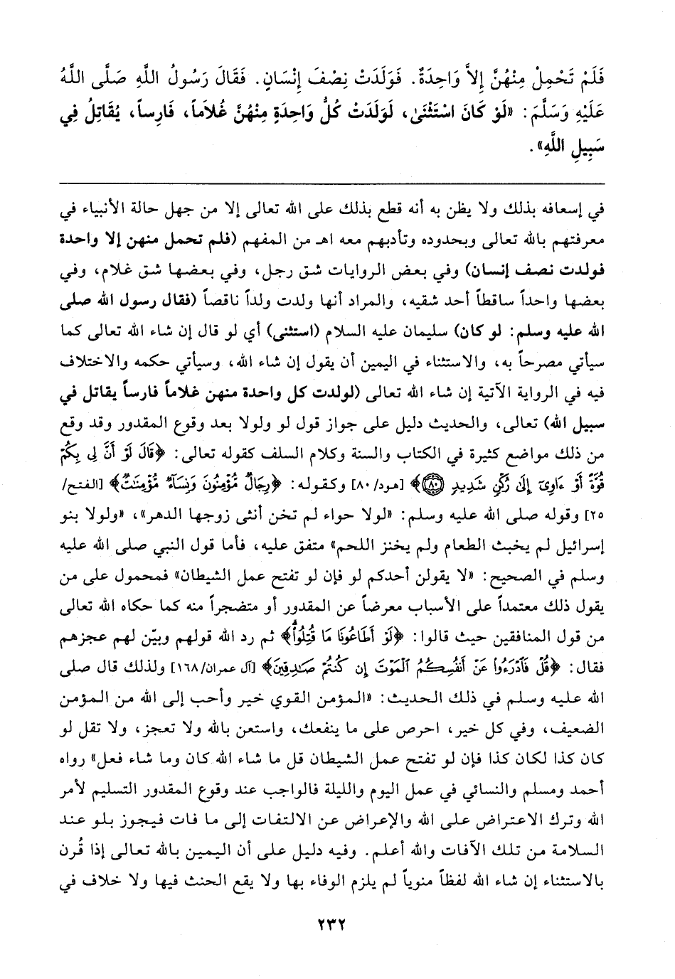 فَلَمْ تَحْمِلْ مِنْهُنَّ إِلا وَاحِدَةٌ. فَوَلَدَتْ نِصْفَ إِنْسَانٍ. فَقَال رَسُولُ الله صلى الله عَلَيهِ وَسَلمَ: "لو كانَ اسْتَثْنَى، لَوَلَدَتْ كُل وَاحِدَةٍ مِنْهُن غلامًا، فَارِسًا، يُقَاتِلُ فِي سَبِيلِ اللهِ"