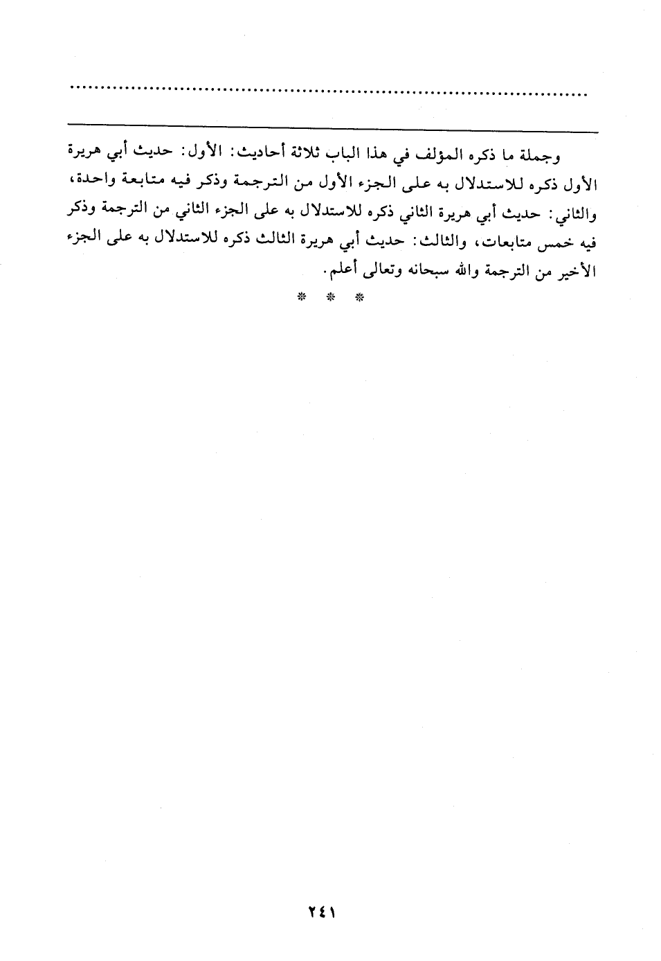 وجملة ما ذكره المؤلف في هذا الباب ثلاثة أحاديث: الأول: حديث أبي هريرة الأول ذكره للاستدلال به على الجزء الأول من الترجمة وذكر فيه متابعة واحدة، والثاني: حديث أبي هريرة الثاني ذكره للاستدلال به على الجزء الثاني من الترجمة وذكر فيه خمس متابعات، والثالث: حديث أبي هريرة الثالث ذكره للاستدلال به على الجزء الأخير من الترجمة والله سبحانه وتعالى أعلم.