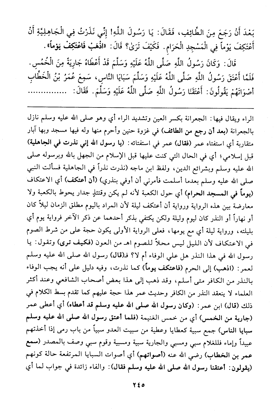 الراء ويقال فيها: الجعرانة بكسر العين وتشديد الراء أي وهو صلى الله عليه وسلم نازل بالجعرانة (بعد أن رجع من الطائف) في غزوة حنين وأحرم منها وله فيها مسجد وبها آبار متقاربة أي استفتاه عمر (فقال) عمر في استفتائه: (يا رسول الله إني نذرت في الجاهلية) قبل إسلامي؛ أي في الحال التي كنت عليها قبل الإسلام من الجهل بالله وبرسوله صلى الله عليه وسلم وبشرائع الدين، ولفظ ابن ماجه (نذرت نذرًا في الجاهلية فسألت النبي صلى الله عليه وسلم بعدما أسلمت فأمرني أن أوفي بنذري) (أن أعتكف) أي الاعتكاف (يومًا في المسجد الحرام) أي حول الكعبة لأنه لم يكن وقتئذٍ جدار يحوط بالكعبة ولا معارضة بين هذه الرواية ورواية أن أعتكف ليلة لأن المراد باليوم مطلق الزمان ليلًا كان أو نهارًا أو النذر كان ليوم وليلة ولكن يكتفي بذكر أحدهما عن ذكر الآخر فرواية يوم أي بليلته، ورواية ليلة أي مع يومها، فعلى الرواية الأولى يكون حجة على من شرط الصوم في الاعتكاف لأن الليل ليس محلًا للصوم اهـ من العون (فكيف ترى) وتقول: يا رسول الله في هذا النذر هل علي الوفاء أم لا؟ فـ (قال) رسول الله صلى الله عليه وسلم لعمر: (اذهب) إلى الحرم (فاعتكف يومًا) كما نذرت، وفيه دليل على أنه يجب الوفاء بالنذر من الكافر متى أسلم، وقد ذهب إلى هذا بعض أصحاب الشافعي وعند أكثر العلماء لا ينعقد النذر من الكافر وحديث عمر هذا حجة عليهم كما تقدم بسط الكلام في ذلك (قال) ابن عمر: (وكان رسول الله صلى الله عليه وسلم قد أعطاه) أي أعطى عمر (جارية من الخمس) أي من خمس الغنيمة (فلما أعتق رسول الله صلى الله عليه وسلم سبايا الناس) جمع سبية كعطايا وعطية من سبيت العدو سبيًا من باب رمى إذا أخذتهم عبيدًا وإماء فللغلام سبي ومسبي والجارية سبية ومسبية وقوم سبي وصف بالمصدر (سمع عمر بن الخطاب) رضي الله عنه (أصواتهم) أي أصوات السبايا المرتفعة حالة كونهم (يقولون: أعتقنا رسول الله صلى الله عليه وسلم فقال): والفاء زائدة في جواب لما أي