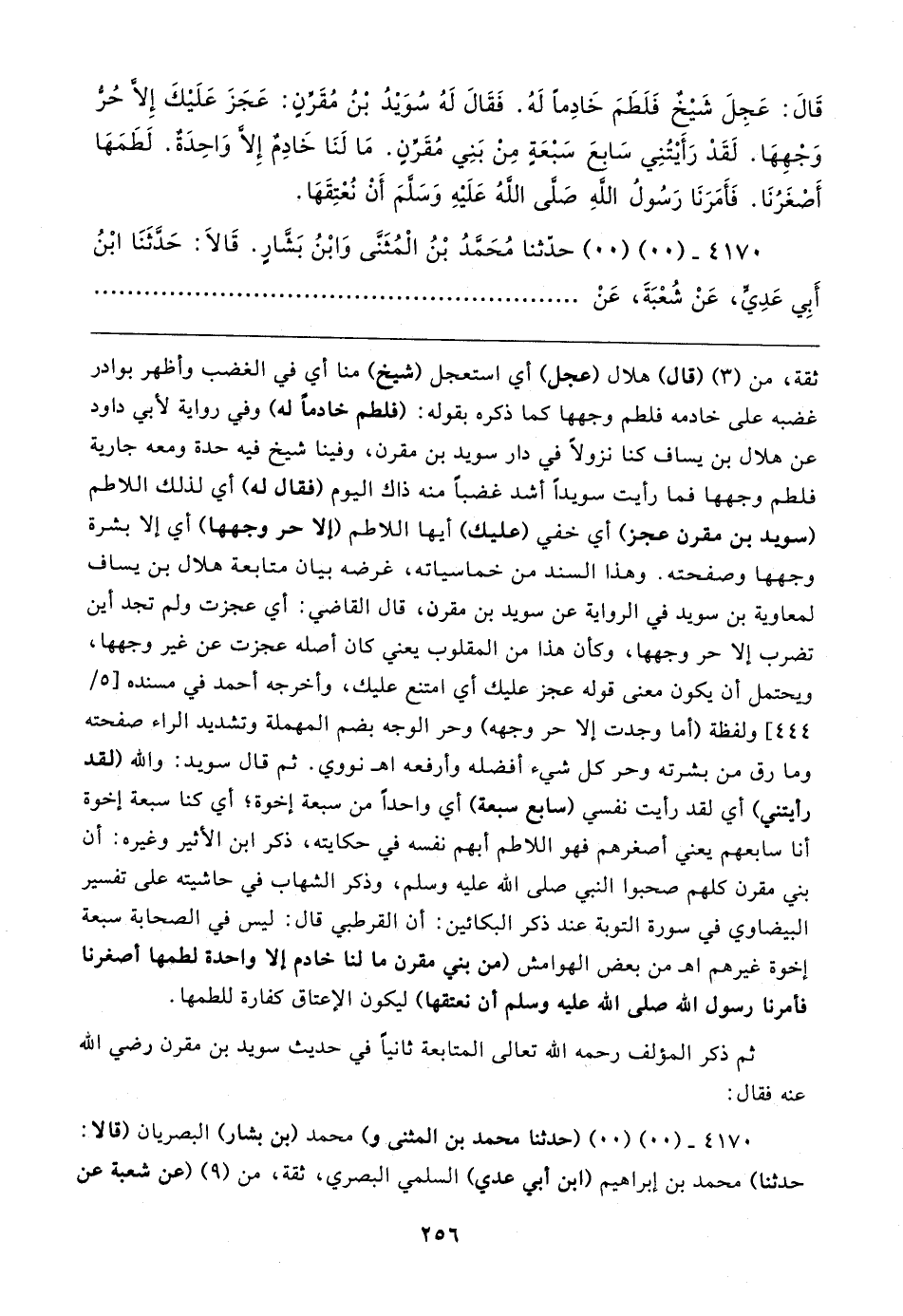 قَال: عَجِلَ شَيخٌ فَلَطَمَ خَادِمًا لَهُ. فَقَال لَهُ سُوَيدُ بْنُ مُقَرنٍ: عَجَزَ عَلَيكَ إِلا حُرُّ وَجْهِهَا. لَقَدْ رَأَيتُنِي سَابع سَبْعَةٍ مِنْ بَنِي مُقَرِّنٍ. مَا لَنَا خَادِمٌ إِلا وَاحِدَةٌ. لَطَمَهَا أَصْغَرُنَا. فَأَمَرَنَا رَسُولُ الله صلى الله عَلَيهِ وَسَلمَ أَنْ نُعْتِقَهَا.