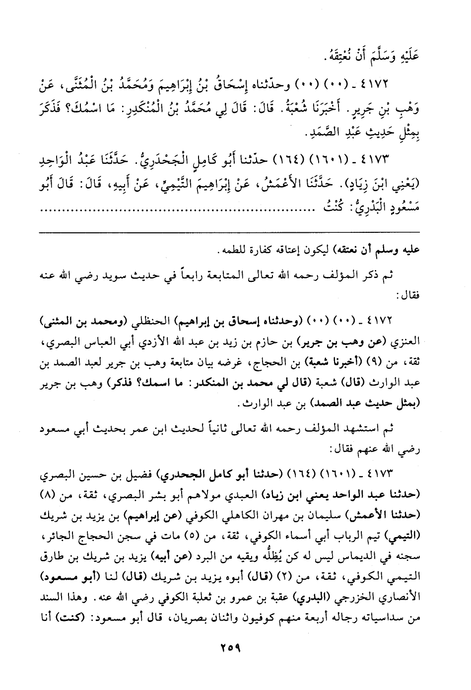 ٤١٧٣ - (١٦٠١) (٦٤ ١) (حدثنا أبو كامل الجحدري) فضيل بن حسين البصري (حدثنا عبد الواحد يعني ابن زياد) العبدي مولاهم أبو بشر البصري، ثقة، من (٨) (حدثنا الأعمش) سليمان بن مهران الكاهلي الكوفي (عن إبراهيم) بن يزيد بن شريك (التيمي) تيم الرباب أبي أسماء الكوفي، ثقة، من (٥) مات في سجن الحجاج الجائر، سجنه في الديماس ليس له كن يُظِلُّه ويقيه من البرد (عن أبيه) يزيد بن شريك بن طارق التيمي الكوفي، ثقة، من (٢) (قال) أبوه يزيد بن شريك (قال) لنا (أبو مسعود) الأنصاري الخزرجي (البدري) عقبة بن عمرو بن ثعلبة الكوفي رضي الله عنه. وهذا السند من سداسياته رجاله أربعة منهم كوفيون واثنان بصريان، قال أبو مسعود: (كنت) أنا