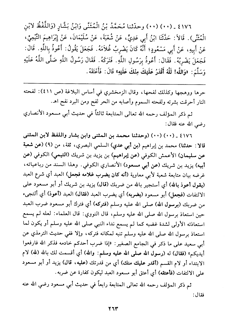 ٤١٧٦ - (٠٠) (٠٠) وحدّثنا مُحَمدُ بْنُ الْمُثَنَّى وَابْنُ بَشَّارٍ (وَاللَّفظُ لابْنِ الْمُثَنَّى). قَالا: حَدَّثَنَا ابْنُ أَبِي عَدِيٍّ، عَنْ شُعْبَةَ، عَنْ سُلَيمَانَ، عَنْ إِبْرَاهِيمَ التَّيمِي، عَنْ أَبِيهِ، عَنْ أَبِي مَسْعُودٍ؛ أَنَّهُ كَانَ يَضْرِبُ غُلامَهُ. فَجَعَلَ يَقُولُ: أَعُوذُ بِاللهِ. قَال: فَجَعَلَ يَضْرِبُهُ. فَقَال: أَعُوذُ بِرَسُولِ اللَّهِ. فَتَرَكَهُ. فَقَال رَسُولُ الله صَلى اللهُ عَلَيهِ وَسَلمَ: "وَالله! لَلَّهُ أَقْدَرُ عَلَيكَ مِنْكَ عَلَيهِ" قَال: فَأَعْتَقَهُ