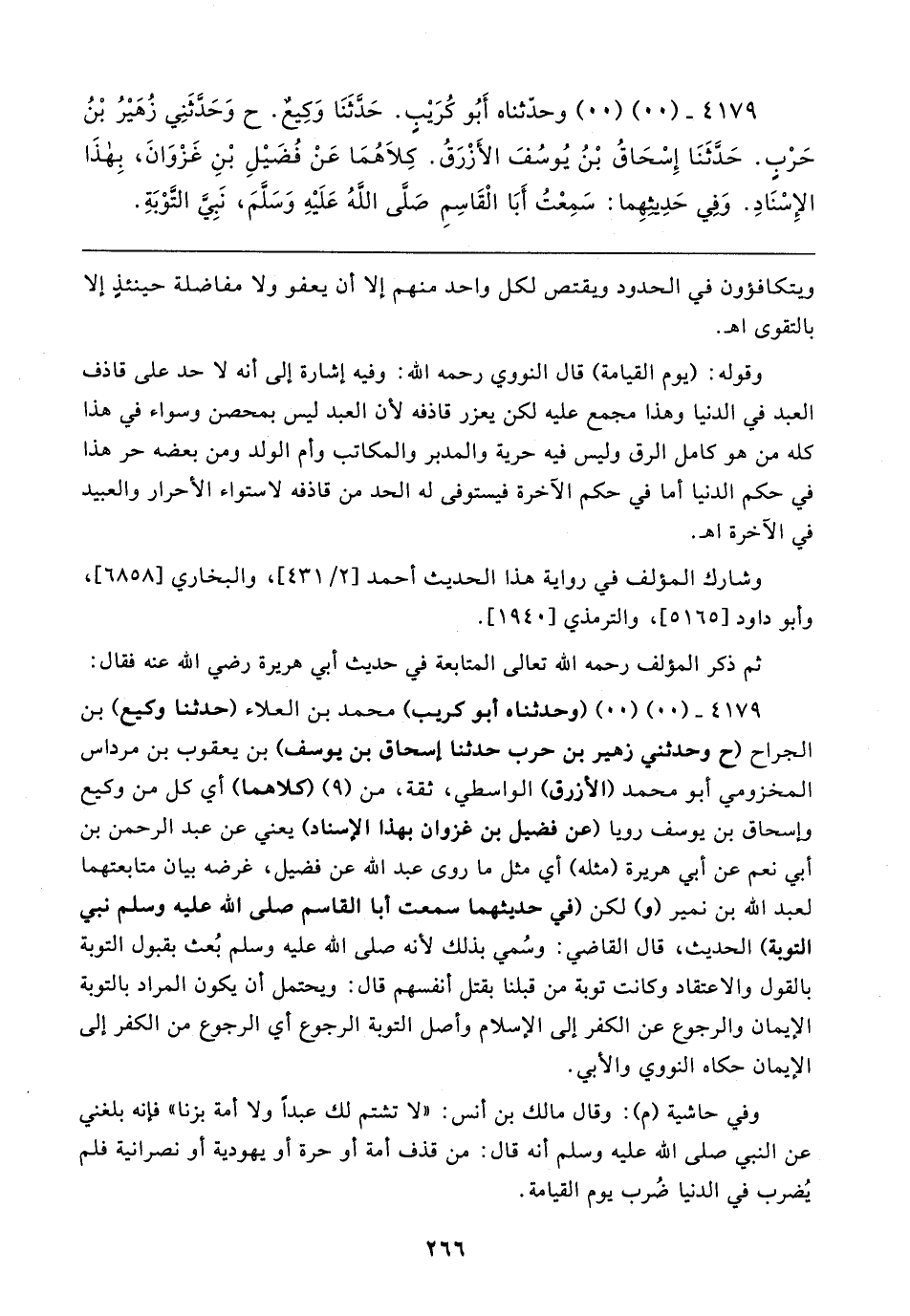 ٤١٧٩ - (٠٠) (٠٠) (وحدثناه أبو كريب) محمد بن العلاء (حدثنا وكيع) بن الجراح (ح وحدثني زهير بن حرب حدثنا إسحاق بن يوسف) بن يعقوب بن مرداس المخزومي أبو محمد (الأزرق) الواسطي، ثقة، من (٩) (كلاهما) أي كل من وكيع وإسحاق بن يوسف رويا (عن فضيل بن غزوان بهذا الإسناد) يعني عن عبد الرحمن بن أبي نعم عن أبي هريرة (مثله) أي مثل ما روى عبد الله عن فضيل، غرضه بيان متابعتهما لعبد الله بن نمير (و) لكن (في حديثهما سمعت أبا القاسم صلى الله عليه وسلم نبي التوبة) الحديث، قال القاضي: وسُمي بذلك لأنه صلى الله عليه وسلم بُعث بقبول التوبة بالقول والاعتقاد وكانت توبة من قبلنا بقتل أنفسهم قال: ويحتمل أن يكون المراد بالتوبة الإيمان والرجوع عن الكفر إلى الإسلام وأصل التوبة الرجوع أي الرجوع من الكفر إلى الإيمان حكاه النووي والأبي.