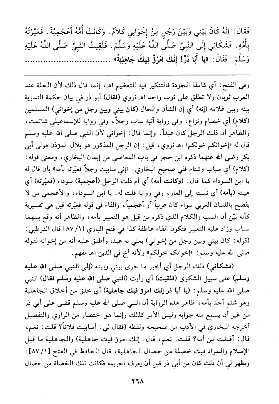 فَقَال: إِنهُ كَانَ بَينِي وَبَينَ رَجُلٍ مِنْ إِخْوَانِي كَلامٌ. وَكَانَتْ أمهُ أَعْجَمِيَّةً. فَعَيَّرْتُهُ بِأُمِّهِ. فَشَكَانِي إِلَى النَّبِيّ صَلى الله عَلَيهِ وَسَلمَ. فَلَقِيتُ النَّبِيّ صلى الله عَلَيهِ وَسَلمَ. فَقَال: "يَا أَبَا ذَرٍّ! إِنكَ امْرُؤ فِيكَ جَاهِلِية"