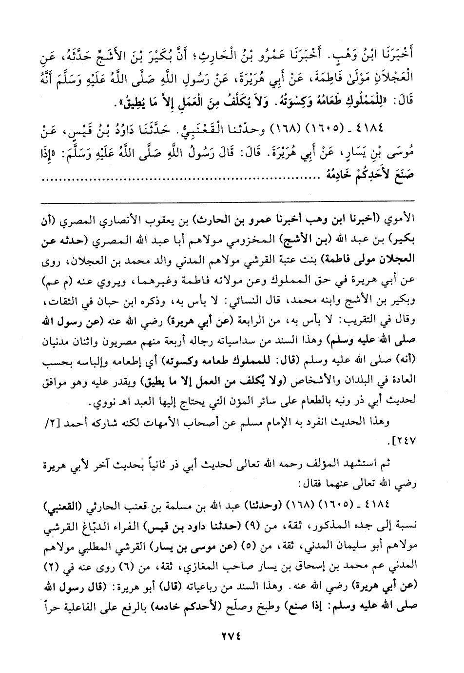 أَخْبَرَنَا ابْنُ وَهْبٍ. أَخْبَرَنَا عَمْرُو بْنُ الْحَارِثِ؛ أَنَّ بُكَيرَ بْنَ الأَشَجِّ حَدَّثَهُ، عَنِ الْعَجْلانِ مَوْلَى فَاطِمَةَ، عَنْ أَبِي هُرَيرَةَ، عَنْ رَسُولِ اللهِ - صلى الله عليه وسلم - أَنَّهُ قَال: "لِلْمَمْلُوكِ طَعَامُهُ وَكسْوَتُهُ. وَلَا يُكَلَّفُ مِنَ الْعَمَلِ إِلَّا مَا يُطِيقُ".