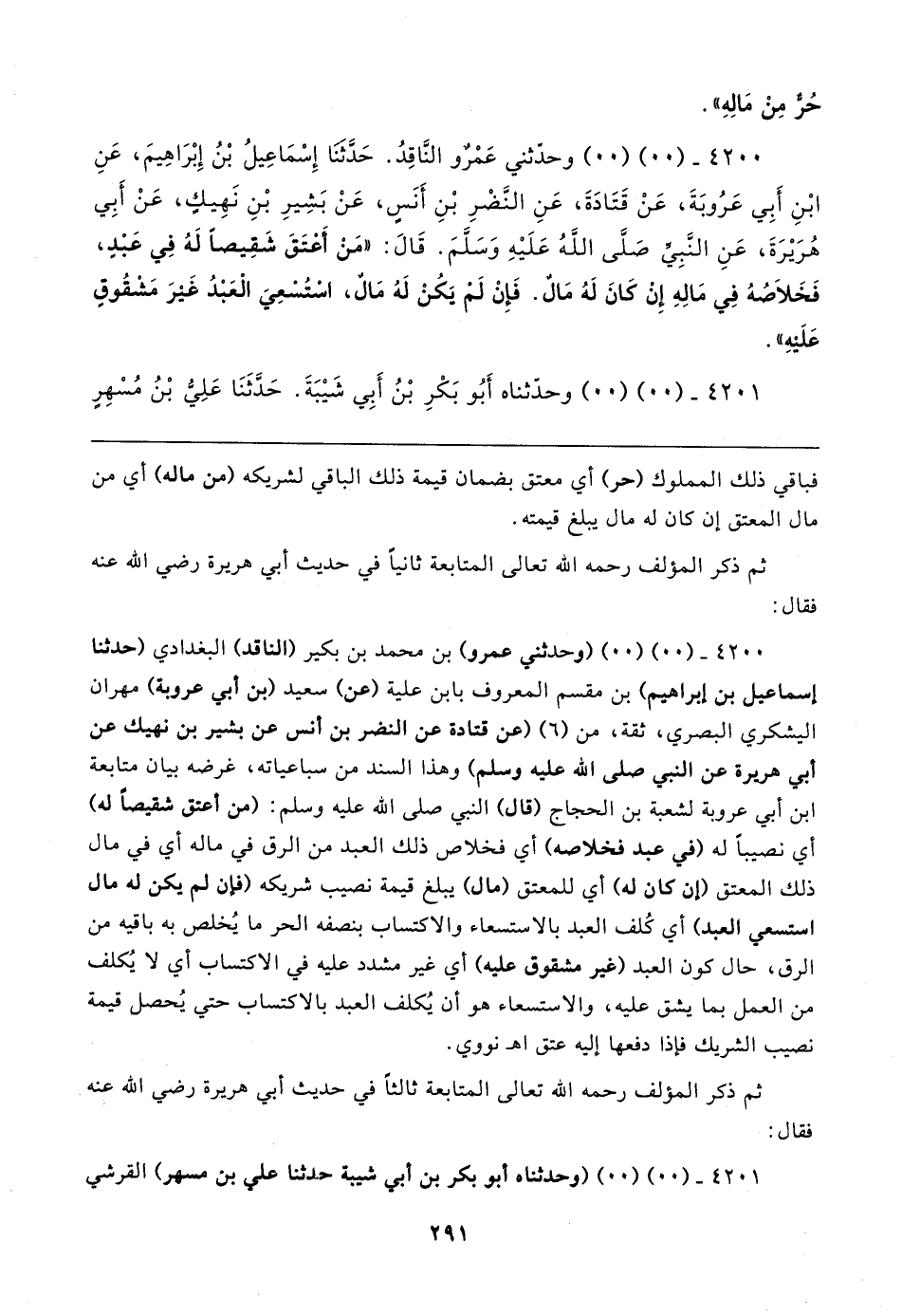 ٤٢٠٠ - (٠٠) (٠٠) وحدّثني عَمْرٌو النَّاقِدُ. حَدَّثنَا إِسْمَاعِيلُ بْنُ إِبْرَاهِيمَ، عَنِ ابْنِ أَبِي عَرُوبَةَ، عَنْ قَتَادَةَ، عَنِ النَّضْرِ بْنِ أَنَسٍ، عَنْ بَشِيرِ بْنِ نَهِيكٍ، عَنْ أَبِي هُرَيرَةَ، عَنِ النَّبِيِّ - صلى الله عليه وسلم -. قَال: "مَنْ أَعْتَقَ شَقِيصًا لَهُ فِي عَبْدٍ، فَخَلاصُهُ فِي مَالِهِ إِنْ كَانَ لَهُ مَالٌ. فَإِنْ لَمْ يَكُنْ لَهُ مَالٌ، اسْتُسْعِيَ الْعَبْدُ غَيرَ مَشْقُوقٍ عَلَيهِ".