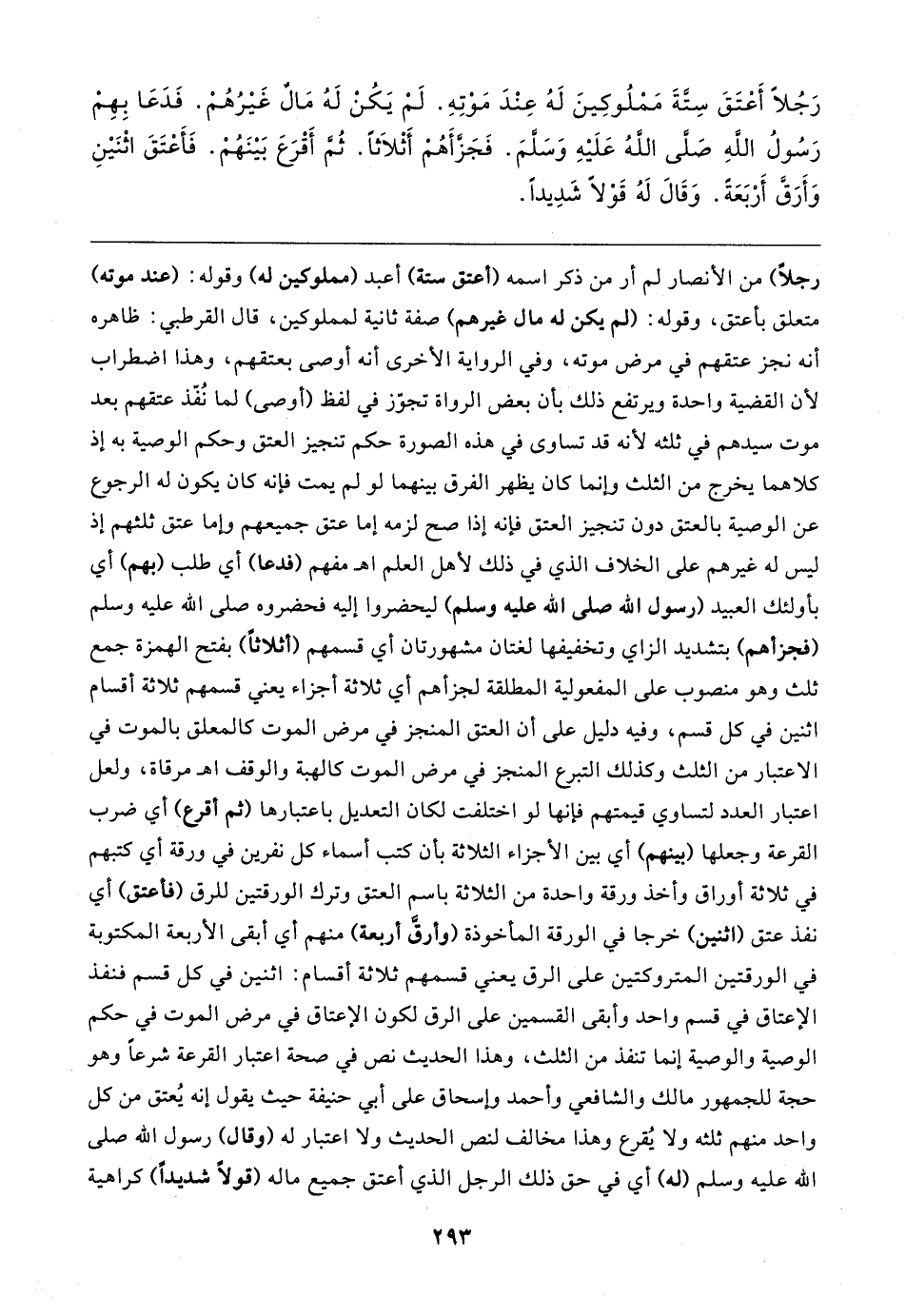 رَجُلًا أَعْتَقَ سِتَّةَ مَمْلُوكِينَ لَهُ عِنْدَ مَوْتِهِ. لَمْ يَكُنْ لَهُ مَالٌ غَيرُهُمْ. فَدَعَا بِهِمْ رَسُولُ اللهِ - صلى الله عليه وسلم -. فَجَزَّأَهُمْ أَثْلاثًا. ثُمَّ أَقْرَعَ بَينَهُمْ. فَأَعْتَقَ اثْنَينِ وَأَرَقَّ أَرْبَعَةً. وَقَال لَهُ قَوْلًا شَدِيدًا
