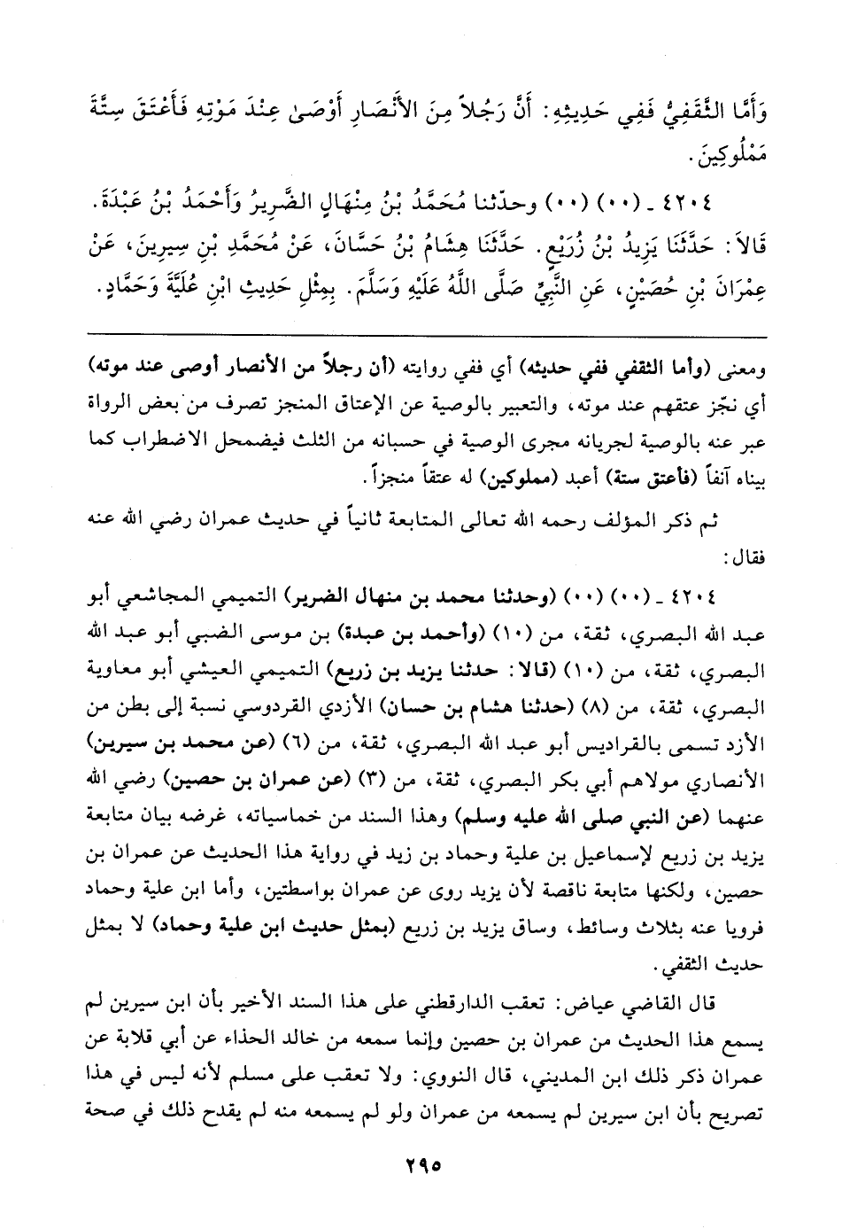 ٤٢٠٤ - (٠٠) (٠٠) (وحدثنا محمد بن منهال الضرير) التميمي المجاشعي أبو عبد الله البصري، ثقة، من (١٠) (وأحمد بن عبدة) بن موسى الضبي أبو عبد الله البصري، ثقة، من (١٠) (قالا: حدثنا يزيد بن زريع) التميمي العيشي أبو معاوية البصري، ثقة، من (٨) (حدثنا هشام بن حسان) الأزدي القردوسي نسبة إلى بطن من الأزد تسمى بالقراديس أبو عبد الله البصري، ثقة، من (٦) (عن محمد بن سيرين) الأنصاري مولاهم أبي بكر البصري، ثقة، من (٣) (عن عمران بن حصين) - رضي الله عنهما - (عن النبي - صلى الله عليه وسلم -) وهذا السند من خماسياته، غرضه بيان متابعة يزيد بن زريع لإسماعيل بن علية وحماد بن زيد في رواية هذا الحديث عن عمران بن حصين، ولكنها متابعة ناقصة لأن يزيد روى عن عمران بواسطتين، وأما ابن علية وحماد فرويا عنه بثلاث وسائط، وساق يزيد بن زريع (بمثل حديث ابن علية وحماد) لا بمثل حديث الثقفي.