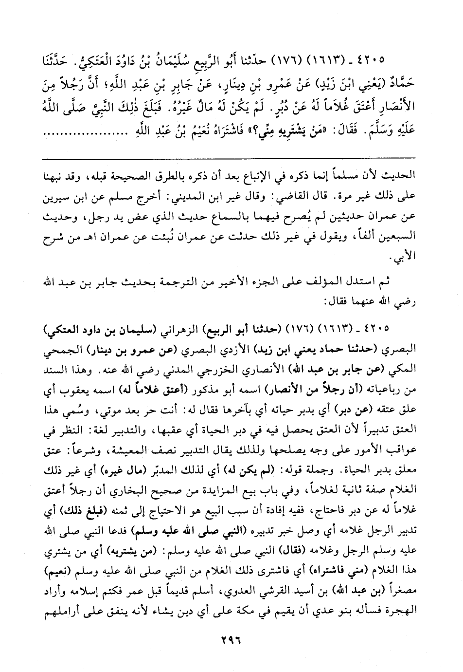 ٤٢٠٥ - (١٦١٣) (١٧٦) حدَّثنا أَبُو الرَّبِيعِ سُلَيمَانُ بْنُ دَاوُدَ الْعَتَكِيُّ. حَدَّثَنَا حَمَّادٌ (يَعْنِي ابْنَ زَيدٍ) عَنْ عَمْرِو بْنِ دِينَارٍ، عَنْ جَابِرِ بْنِ عَبْدِ اللهِ؛ أَنَّ رَجُلًا مِنَ الأَنْصَارِ أَعْتَقَ غُلامًا لَهُ عَنْ دُبُرٍ. لَمْ يَكُنْ لَهُ مَالٌ غَيرُهُ. فَبَلَغَ ذلِكَ النَّبِيَّ - صلى الله عليه وسلم -. فَقَال: "مَنْ يَشْتَرِيهِ مِنِّي؟ " فَاشْتَرَاهُ نُعَيمُ بْنُ عَبْدِ اللهِ